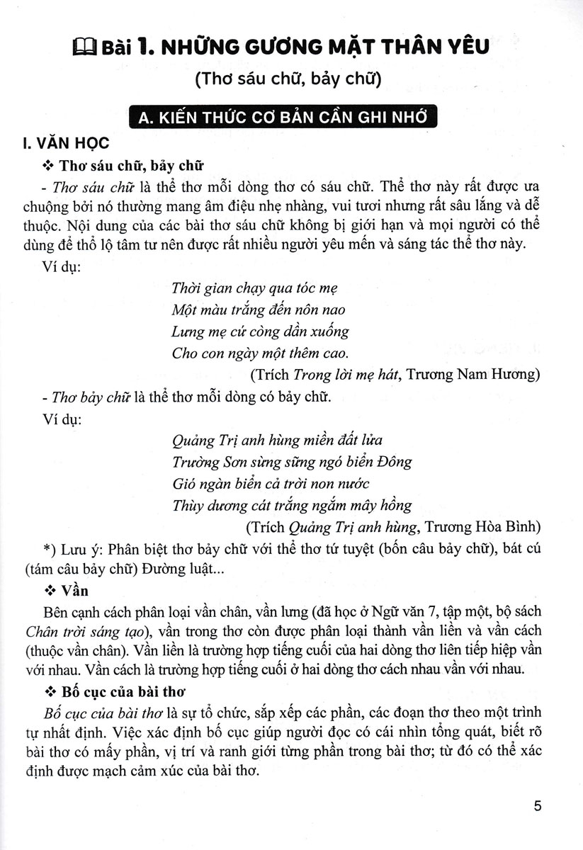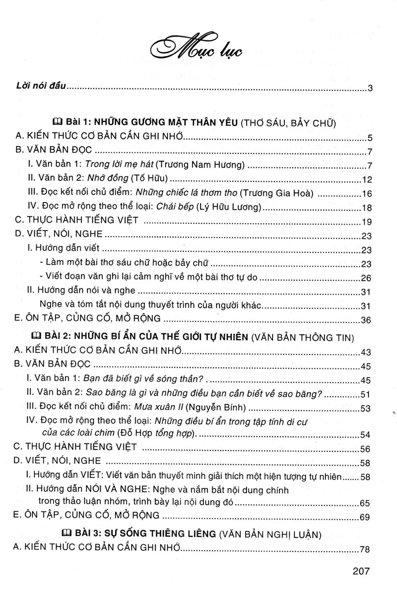 Hướng Dẫn Học Ngữ Văn 8 - Tập 1 (Dùng Kèm SGK Chân Trời Sáng Tạo) Đồng hành cùng với chủ trương lớn của Đảng, Nhà nước về việc thay đổi sách giáo khoa, trong đó có môn Ngữ văn, quý thầy cô và các em học sinh sẽ có rất nhiều bỡ ngỡ, khó khăn trong những thời gian đầu tiếp cận với nội dung và phương pháp, đặc biệt là dạy học phát triển phẩm chất, năng lực. Vì vậy, cuốn sách tham khảo HƯỚNG DẪN HỌC NGỮ VĂN 8 (Dùng kèm SGK Chân trời sáng tạo) của tác giả Kiều Bắc – Nguyễn Thị Hoa - Nguyễn Quốc Khánh sẽ tiếp tục là tài liệu tham khảo thiết thực cho quý thầy cô và các em học sinh ở địa phương chọn bộ sách giáo khoa môn Ngữ văn Chân trời sáng tạo để dạy học. Bằng việc tập trung bồi dưỡng cho học sinh các phẩm chất yêu nước, nhân ái, chăm chỉ, trung thực, trách nhiệm; phát triển các năng lực tự chủ và tự học, giao tiếp và hợp tác, giải quyết vấn đề và sáng tạo cũng như bồi dưỡng năng lực ngôn ngữ và năng lực văn học, cuốn sách gợi mở những cách tiếp cận kiến thức đa chiều, giúp các em phát huy tư duy sáng tạo trong việc học môn Ngữ văn. A. Những Kiến Thức Văn Học Cần Ghi Nhớ B. Văn Bản Đọc - Hướng Dẫn Soạn Bài Ngoài việc hướng dẫn gợi ý trả lời các câu hỏi trong sách giáo khoa, cuốn sách còn giúp thầy cô và các em ôn tập, củng cố, mở rộng thêm vốn kiến thức môn Ngữ văn cũng như tự tin viết và nói được những kiểu văn bản: biểu cảm, nghị luận, thuyết minh,... Để sử dụng hiệu quả cuốn sách này, quý thầy cô và các em nên kết hợp chặt chẽ với bộ sách giáo khoa Chân trời sáng tạo Môn Ngữ văn của Nhà xuất bản Giáo dục Việt Nam. Trong quá trình biên soạn, mặc dù các tác giả đã rất cố gắng song cuốn sách không tránh khỏi những thiếu sót nhất định. Tác giả rất mong nhận được ý kiến đóng góp chân thành của các bạn đọc gần xa đặc biệt là các quý thầy cô và các em học sinh thân yêu để cuốn sách được hoàn thiện hơn trong lần tái bản.
