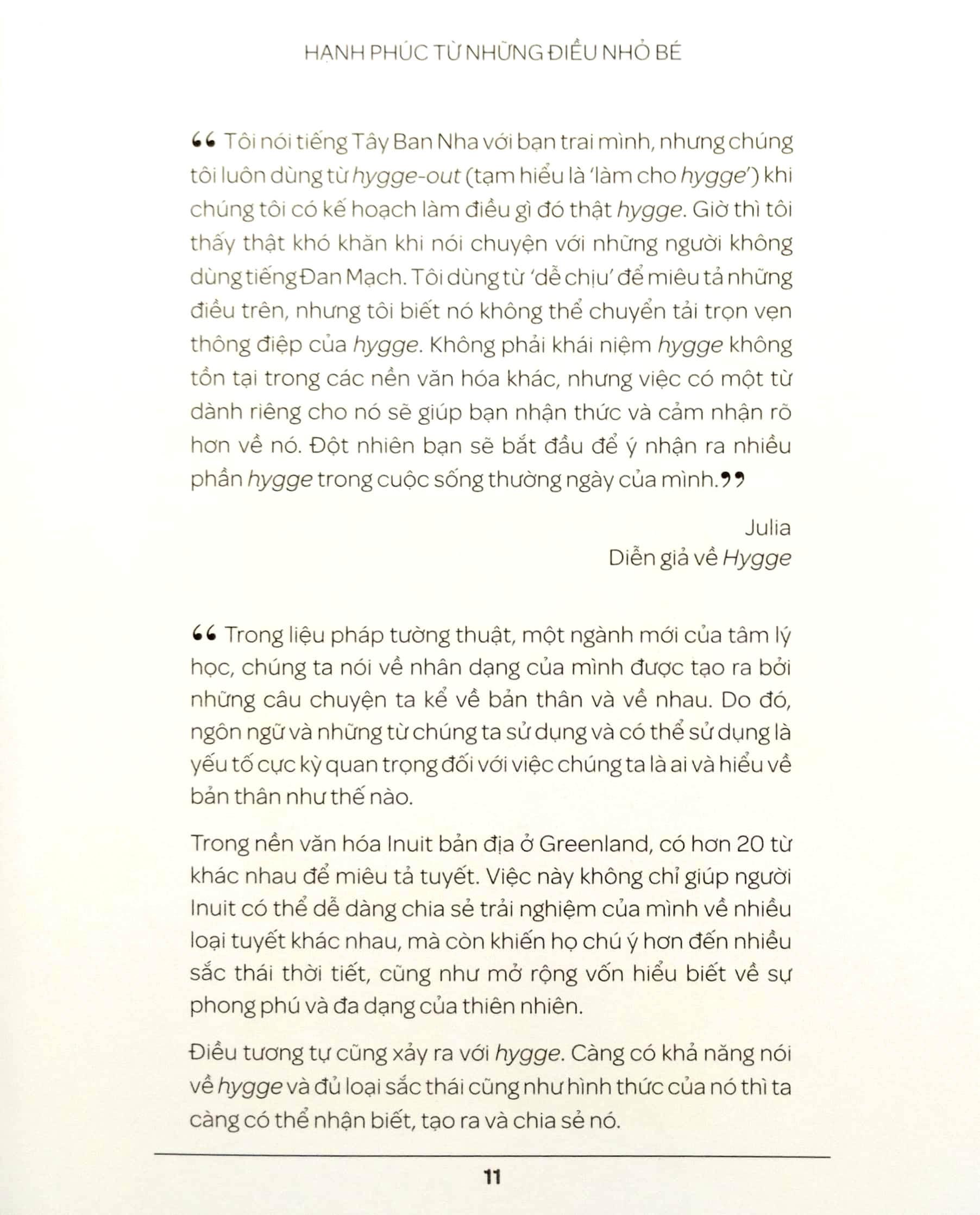 Xuyên suốt quyển sách, người đọc sẽ được rất nhiều người Đan Mạch giải thích về việc họ hygge như thế nào và hygge có ý nghĩa gì với họ: Hygge là ngồi quanh đống lửa trò chuyện với bạn bè trong một đêm hè; Hygge là nhâm nhi ly rượu vang trong khu vườn của mẹ; Hygge là ngồi nghe tiếng mưa rơi tí tách trên mái nhà với một tách trà nóng trên tay….