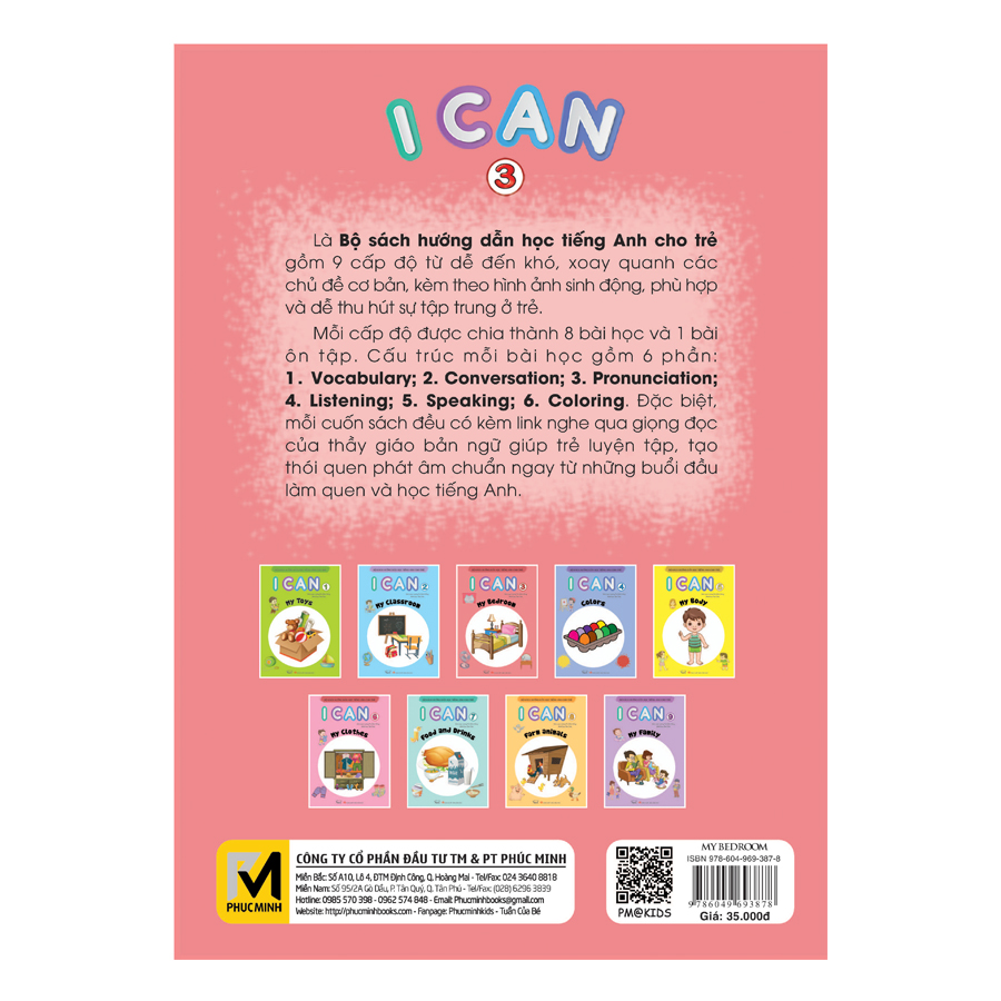 Bộ sách I CAN là bộ sách hướng dẫn học tiếng Anh cho trẻ gồm 9 cuốn từ cấp độ dễ đến khó, xoay quanh các chủ đề cơ bản: My bedroom, Colors, My body, My clothes, Food and drink, Farm animals, My family, kèm hình ảnh sinh động, phù hợp và dễ thu hút sự tập trung ở trẻ.