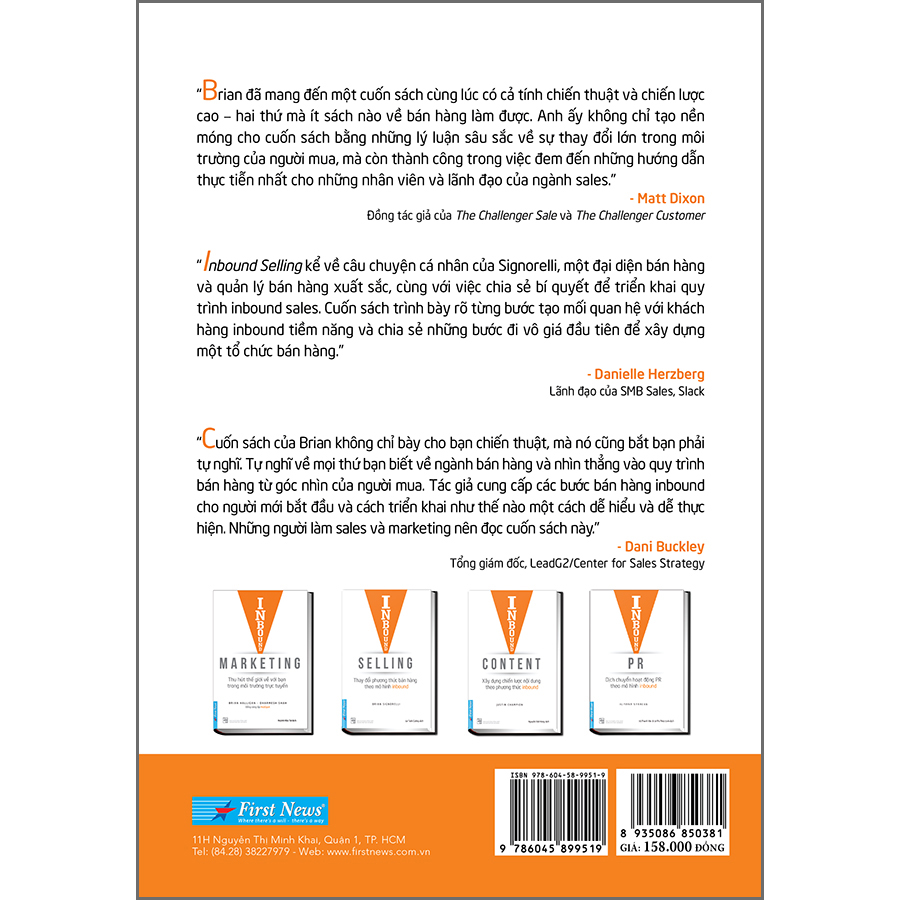 Inbound Selling - Thay Đổi Phương Thức Bán Hàng Theo Mô Hình Inbound Ngày nay với sự phát triển của ngành digital marketing, lượng khách hàng đến từ môi trường trực tuyến có thể cao hơn rất nhiều lần bộ phận sale trực tiếp hoặc các hoạt động marketing truyền thống.  Từ đó, phát sinh rất nhiều sự thay đổi trong quá trình bán hàng: Khách hàng chủ động khám phá và lựa chọn sản phẩm, hoạt động tư vấn bán hàng tốn ít thời gian hơn; các giao dịch diễn ra trên môi trường trực tuyến giảm cho sales rất nhiều khoản phí; việc mua bán trực tuyến tích trữ các nguồn dữ liệu giá trị cho việc cải tiến quy trình sale. Điều này đỏi hỏi người bán hàng và quản lý bán hàng phải có một cách tiếp cận mới trong phương thức bán hàng lẫn đào tạo đội ngũ bán hàng. Bằng kinh nghiệm lâu năm trong ngành bán hàng cũng như những hiểu biết độc đáo của mình, Giám đốc bán hàng của Hubspot – tác giả Brian Signorelli đã hệ thống hóa các bước bán hàng cần thiết, cũng như các xu hướng bán hàng hiện đại từ nhận diện đến kết nối, khám phá, tư vấn và chốt sale với khách hàng, đồng thời tổ chức những đội sale chuyên nghiệp. Trong cuốn sách Inbound Selling, độc giả sẽ tìm hiểu: Inbound Selling đã phát triển từ các phương thức và mô hình của Inbound Marketing như thế vào và cách vận dụng Inbound Selling. Cách tiếp cận từng bước để các chuyên gia bán hàng trở thành chuyên gia Inbound Selling. Những điều cần thiết với một người quản lý, giám đốc bán hàng với đội ngũ những người bán hàng theo phương thức Inbound. Vai trò mà các nhà lãnh đạo điều hành cần thực hiện để chuyển đổi áp dụng phương thức Inbound Selling. Inbound Selling phù hợp với những nhà bán hàng trực tuyến, người quản lý bán hàng, giám đốc điều hành và các chuyên gia bán hàng khác. Là mảnh ghép hoàn chỉnh trong mô hình Inbound, Inbound Selling là phương pháp giúp doanh nghiệp của bạn phát triển và gia tăng doanh số trong thời đại công nghệ số.