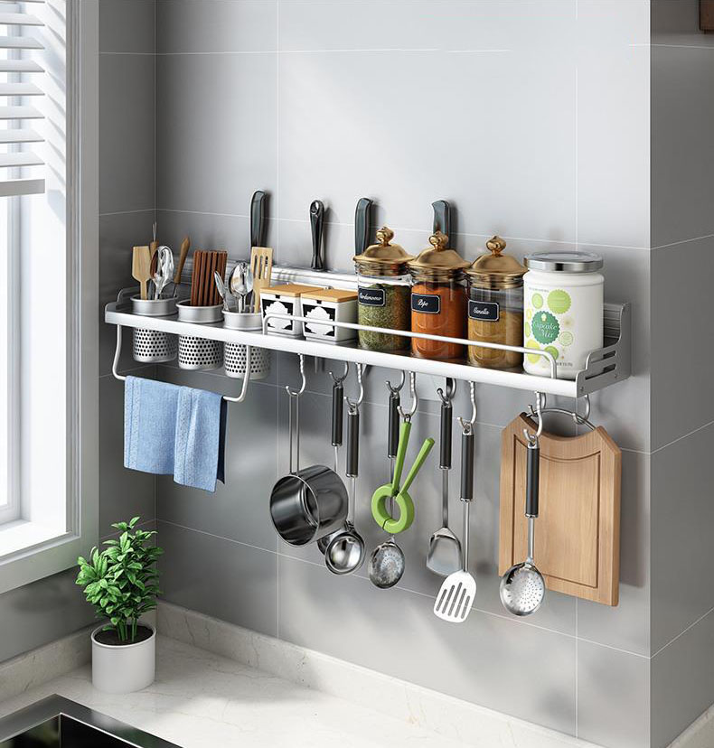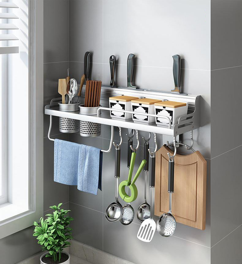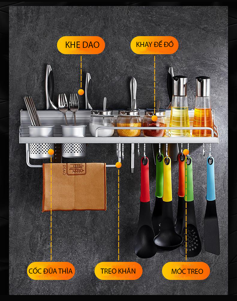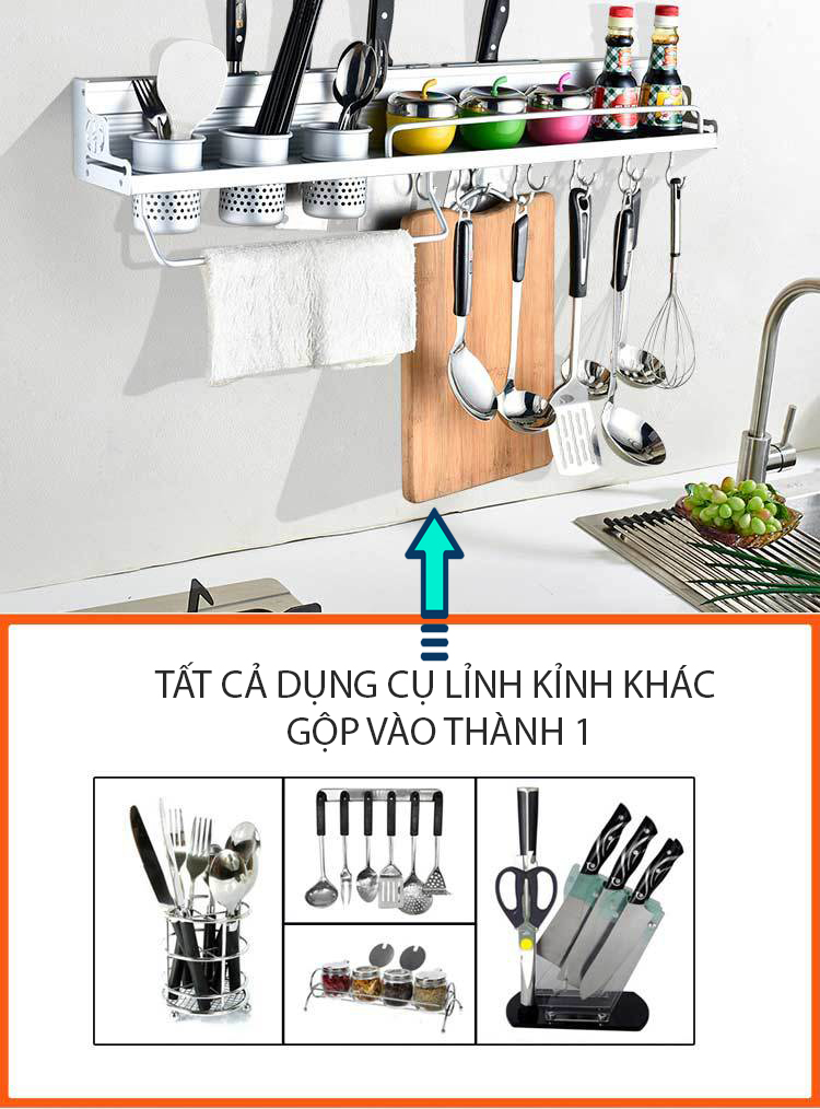 Mô tả chi tiết: Giá treo dụng cụ nhà bếp đa năng giúp bạn sắp xếp gọn gàng các vật dụng như dao, kéo, muỗng, thìa, phới lồng, bàn chải rửa chén, và nhiều loại