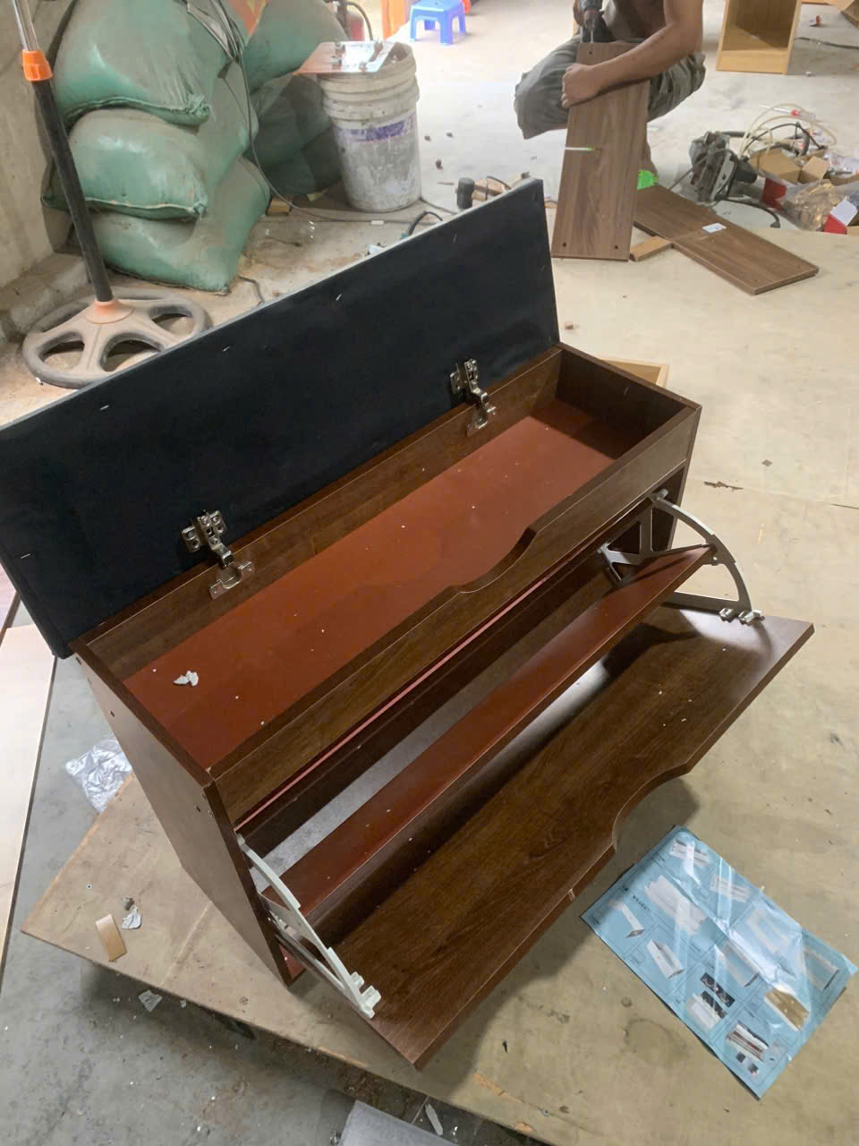 Chất liệu: Ván MDF phủ melamne dày 15mm Mặt nệm dày 3cm Tủ giày thông minh 3 ngăn hiện đại Mỗi tầng để được 4 đôi to tổng 3 tầng để được 12 đến 15 đôi tuỳ vào kích thước size giày
