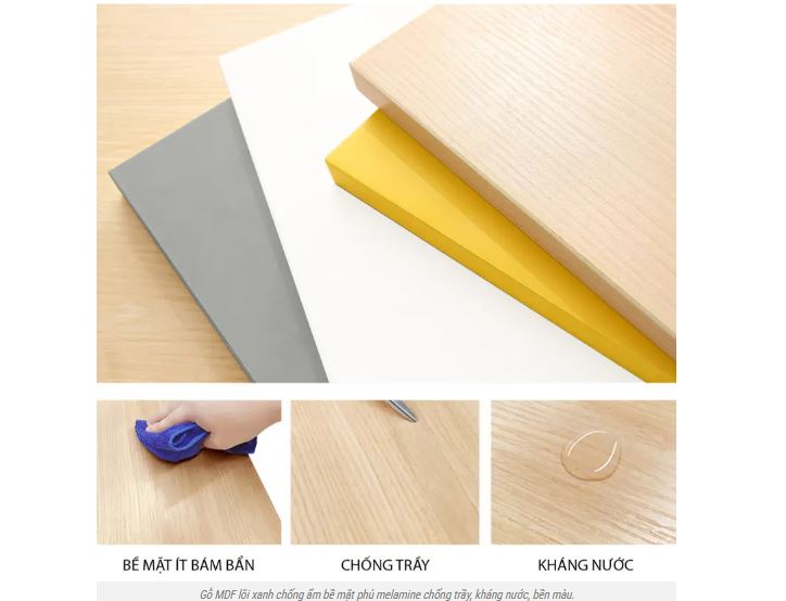 - Chất liệu: Gỗ công nghiệp MDF lõi xanh chống ẩm, loại gỗ có độ bền sử dụng trên 10 năm. Bề mặt được phủ melamine có khả năng chống trầy xước, chịu nhiệt tốt và dễ dàng vệ sinh.
