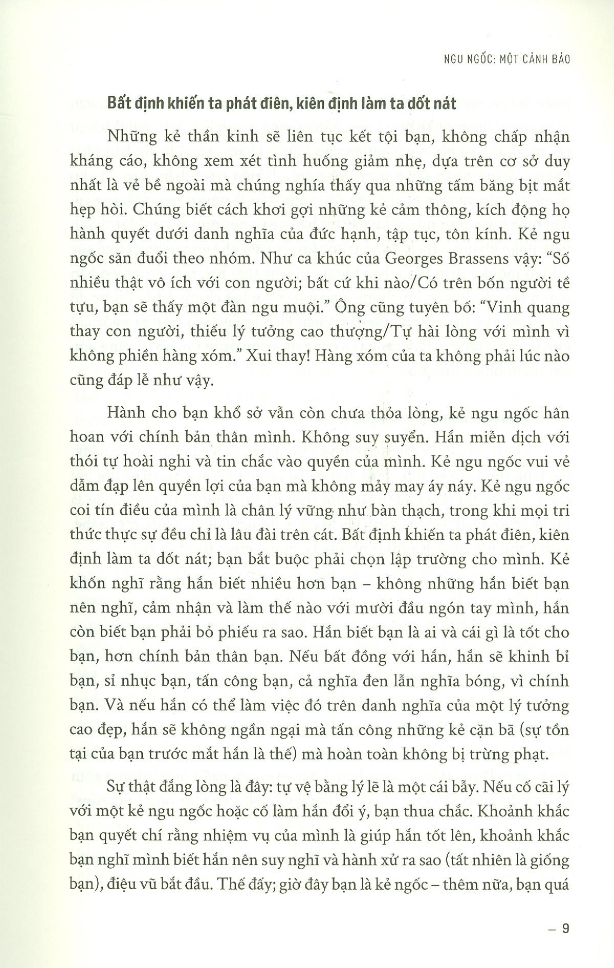 - Độc giả mà cuốn sách hướng tới là những ai? Họ cần giải quyết những công việc gì? Mọi độc giả đều có thể đọc cuốn sách này, vì nội dung sách liên quan đến việc phân tích về sự ngu si của con người trong cả hành động lẫn tâm trí