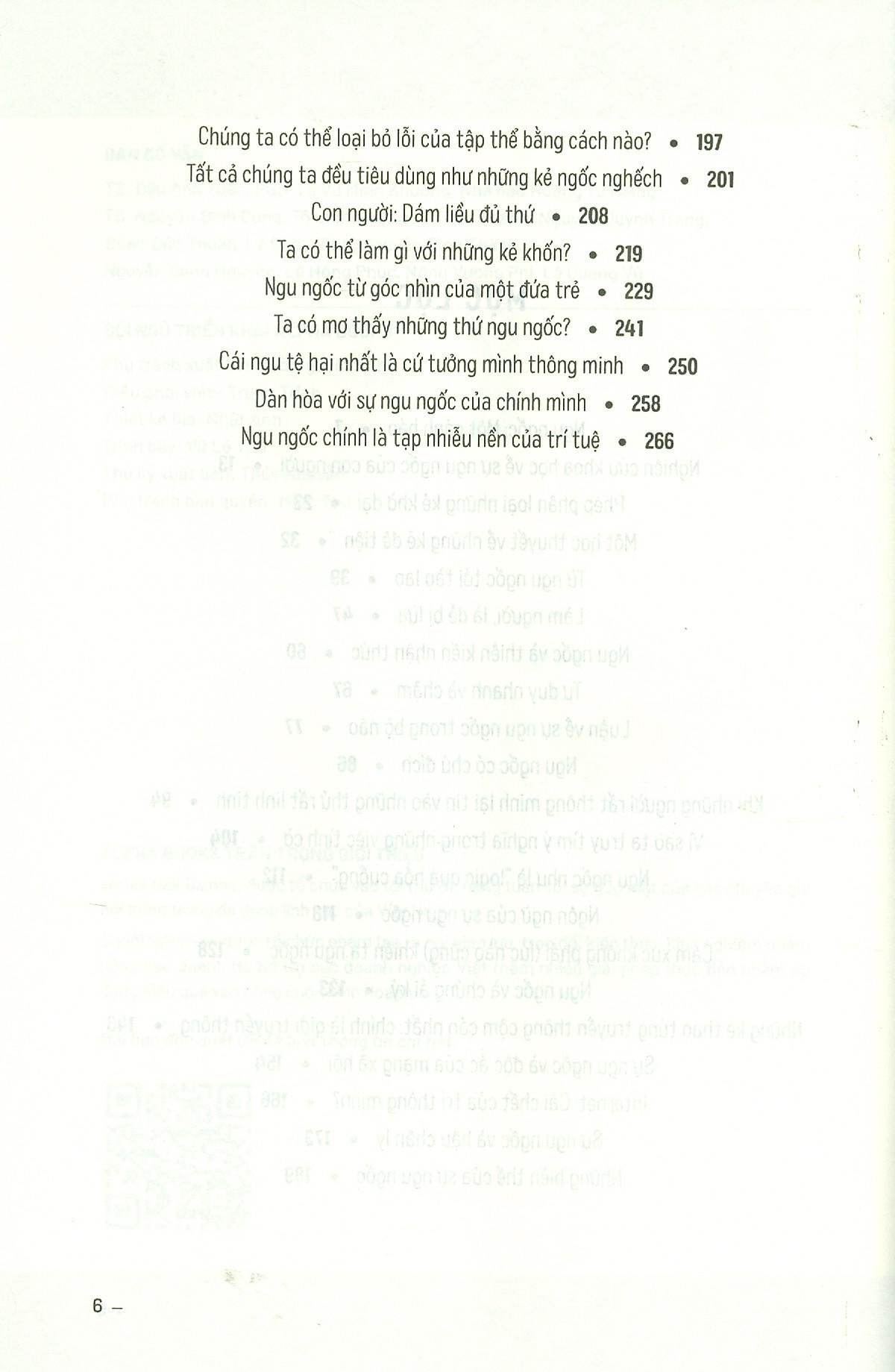 - Tại sao độc giả nên đọc cuốn sách này? Cuốn sách đem đến giá trị gì để giải quyết những lo lắng (đau đớn) của độc giả? (Hoặc tác giả đã giải quyết/đề xuất biện pháp gì để giải quyết nỗi đau trong cuốn sách?) Bao gồm các bài báo luận bàn về sự ngu si của các tác giả được biết đến là một trong những người thông minh nhất Đưa ra các nghiên cứu khoa học về người ngu, các thiên kiến xuất hiện trong nhưng người như vậy (thiên kiến đánh giá quá cao năng lực của bản thân, thiên kiến vị kỷ, thiên kiến miễn nhiễm, thiên kiến miễn tối…) Phân loại về chủng loại ngu dốt, các cấp độ của sự ngu si Kiến thức về học thuyết Con người kinh tế Sự khác nhau giữa hệ thống 1 và 2 trong tư duy Chức năng của não bộ liên quan đến sự ngu si
