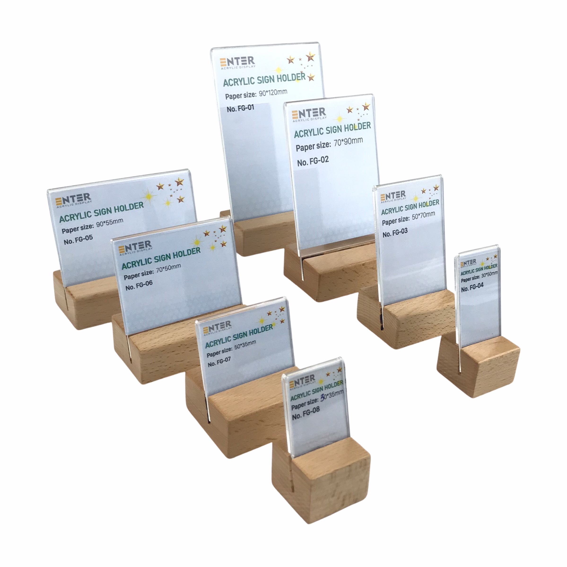 Mô tả sản phẩm Mã barcode Quy cách Đơn vị tính Đóng gói Thương hiệu Xuất xứ FG-01 Thân mica 90 x 120mm Đế gỗ 90 x 40 x 25mm Cái 1 Enter Việt Nam FG-02 Thân mica 70 x 90mm Đế gỗ 70 x 40 x 25mm Cái 1 Enter Việt Nam FG-03 Thân mica 50 x 70mm Đế gỗ 50 x 40 x 25mm Cái 1 Enter Việt Nam FG-04 Thân mica 30 x 50mm Đế gỗ 30 x 30 x 25mm Cái 1 Enter Việt Nam