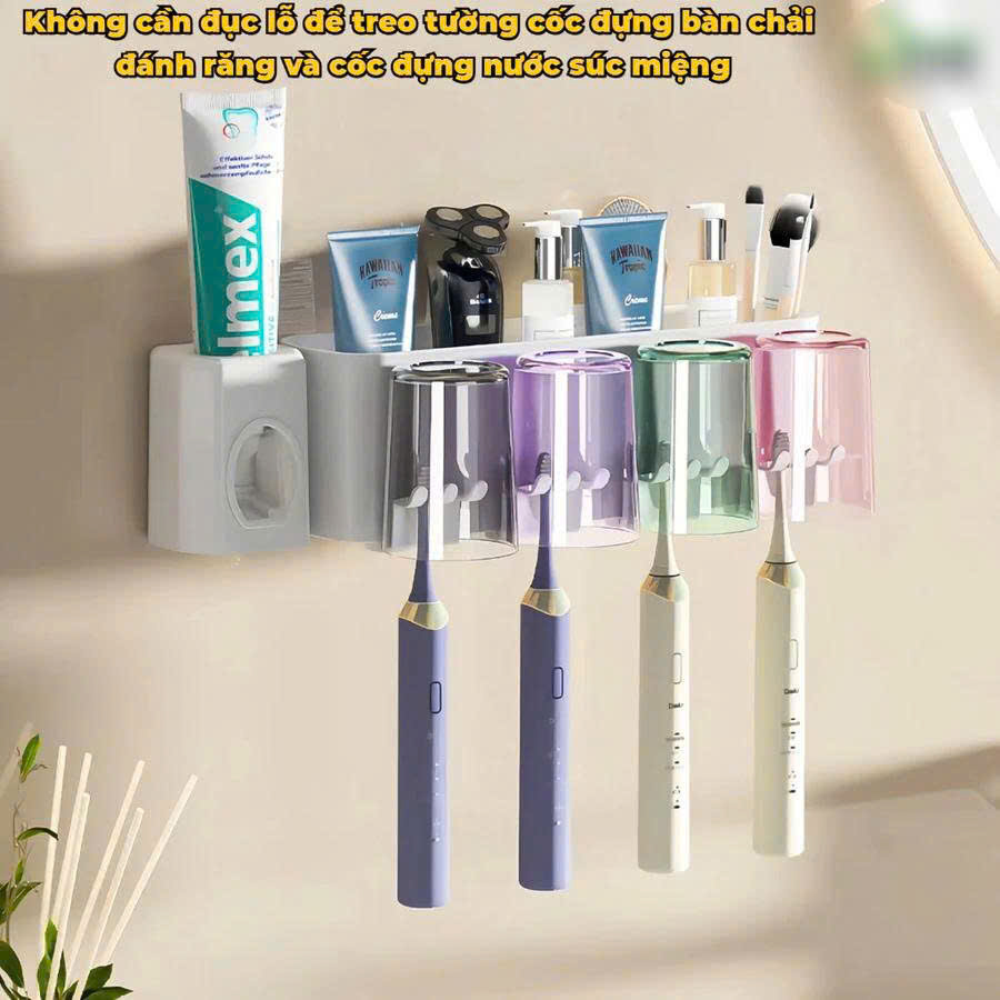 Kệ để bàn chải nhả kem đánh răng tự động thông minh giá treo 4 cốc để đồ dán tường dùng cho nhà tắm
