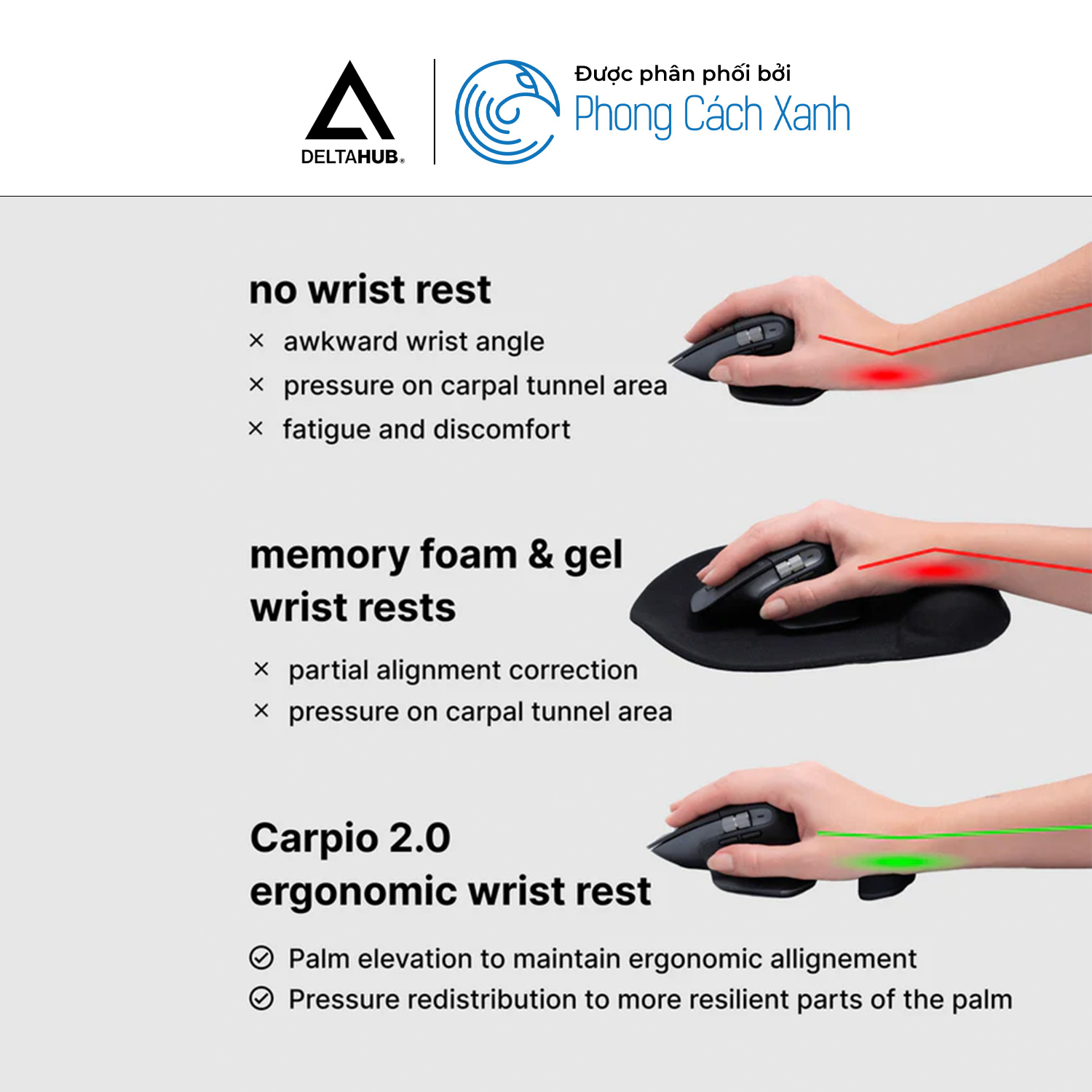 - Kê tay DeltaHub Carpio 2.0 có sự góp mặt của các chuyên gia y tế trong quá trình phát triển sản phẩm chuẩn công thái học. Hầu hết các sản phẩm kê tay trên thị trường đều không mang lại nhiều lợi ích vì đang tạo áp lực lên mặt dưới cổ tay hoặc là ống cổ tay làm cho máu lưu thông chậm. Ngoài ra, nó gây thêm căng thẳng cho cổ tay khi cố định vị trí cổ tay khiến bạn phải di chuyển chuột bằng cách gập cổ tay.