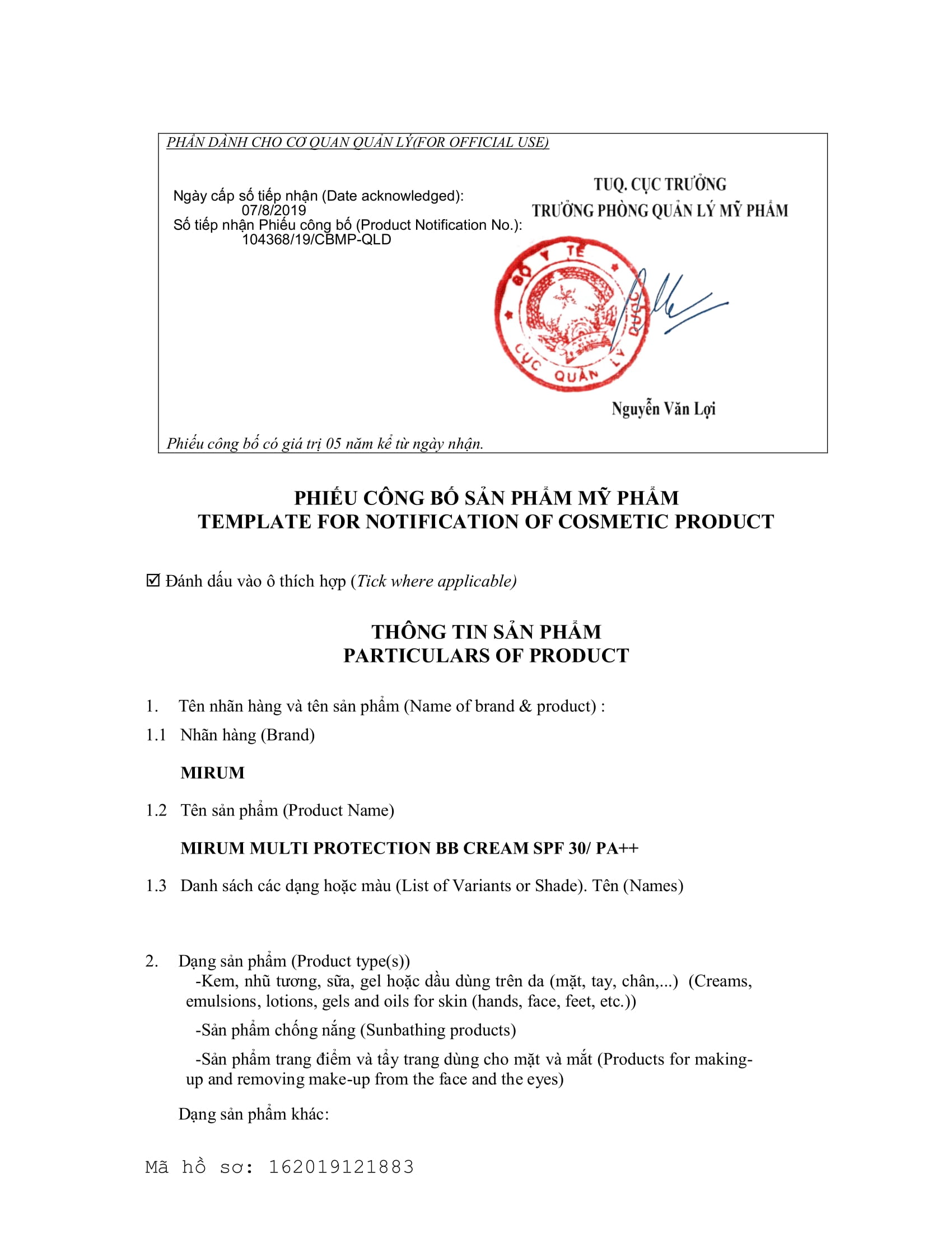 Kem Trang Điểm Đa Tác Động 6 Trong 1 Mirum đã được cấp Phiếu công bố mỹ phẩm số 104368/19/CBMP QLD của Bộ Y tế và tem bảo hộ chống hàng giả của Bộ Công an nhằm chứng nhận sản phẩm an toàn & hợp pháp tại Việt Nam.