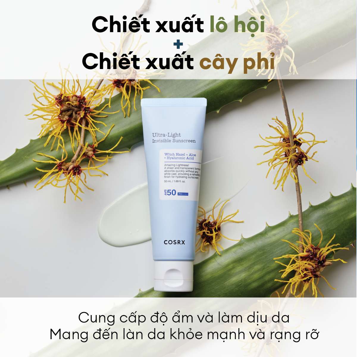 - Thoa lại trong ngày nếu cần thiết, đặc biệt trong trường hợp tiếp xúc với ánh nắng mặt trời trong thời gian dài; QUY TRÌNH DƯỠNG DA CHUẨN COSRX: Tẩy trang > Sữa rửa mặt > Tẩy da chết hoá học AHA/ BHA > Dán mụn/ Chấm mụn > Nước cân bằng (Toner) > Tinh chất dưỡng (Essences/ Serum/ Ampoule) > Dưỡng mắt > Dưỡng ẩm > Kem chống nắng Xuất xứ và sản xuất: Hàn Quốc Hạn sử dụng: 3 năm kể từ ngày sản xuất Ngày sản xuất: In trên bao bì sản phẩm Bảo quản: Nơi khô mát, tránh ánh nắng mặt trời THÀNH PHẦN Aloe Barbadensis Leaf Water, Diethylhexyl Succinate, Propanediol, Aqua/Water, Drometrizole Trisiloxane, Ethylhexyl Triazone, Niacinamide, Diethylamino Hydroxybenzoyl Hexyl Benzoate, Terephthalylidene Dicamphor Sulfonic Acid, 1,2-Hexanediol, Behenyl Alcohol, Methyl Trimethicone, Sodium Polyacryloyldimethyl Taurate, Hamamelis Virginiana (Witch Hazel) Leaf Water, Tromethamine, Polyacrylate Crosspolymer-6, Arachidyl Alcohol, Caprylyl Glycol, Ethylhexylglycerin, Arachidyl Glucoside, Sodium Metaphosphate, Adenosine, Tocopherol, Sodium Hyaluronate, Allantoin, Citric Acid, Sodium Benzoate, Potassium Sorbate >> YÊN TÂM KHI MUA SẮM TẠI GIAN HÀNG CHÍNH HÃNG - COSRX FLAGSHIP STORE ● Cam kết 100% sản phẩm chính hãng ● Nhập khẩu và phân phối độc quyền tại Việt Nam bởi Công ty TNHH KOCOS ● Sản phẩm chính hãng có tem chống hàng giả và nhãn phụ tiếng Việt ● Tư vấn trực tuyến với chuyên gia >> COSRX cam kết sản phẩm: ● Không thử nghiệm trên động vật ● Không chất bảo quản Paraben ● Không chất tẩy rửa Sulfate ● Không hương liệu hoá học Phthalates THÔNG TIN THƯƠNG HIỆU COSRX ra đời vào năm 2013 tại Hàn Quốc sau hơn một thập kỷ nghiên cứu về da và nhu cầu người tiêu dùng với kinh nghiệm trong ngành làm đẹp của người sáng lập - Mr.RX. Tên thương hiệu COSRX được ghép từ Cosmetic (mỹ phẩm) và RX (theo toa) với mục tiêu giải quyết các vấn đề về mụn mang lại vẻ đẹp hoàn hảo cùng bảng thành phần sản phẩm phù hợp với người châu Á. Hiện tại, COSRX đã có mặt tại Việt Nam và được phân phối chính thức, độc quyền bởi Công ty TNHH KOCOS.