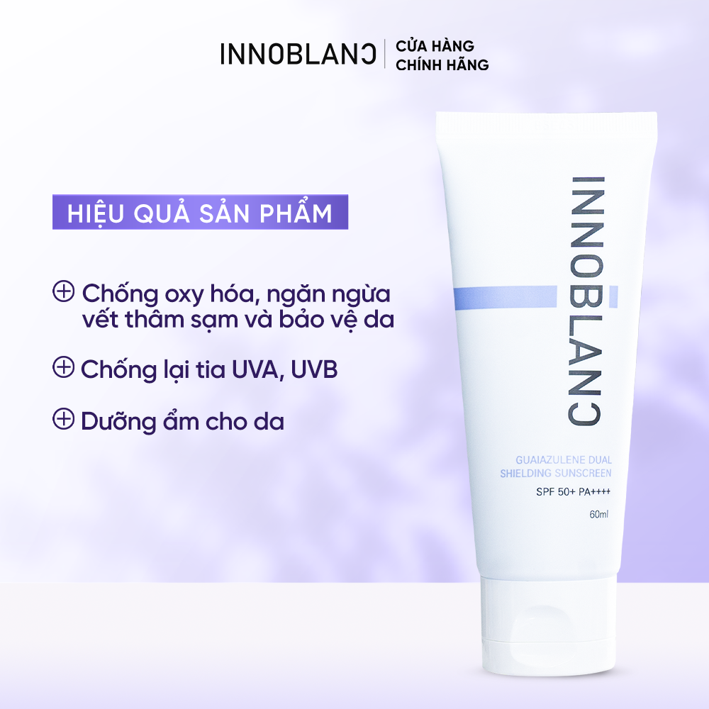 Mua tại TiktokMÔ TẢ SẢN PHẨM: Innoblanc – Guaiazulene Dual Shielding Sunscreen là kem chống nắng kết hợp giữa màng lọc vật lý và hóa học, giúp bảo vệ da toàn diện khỏi tác động của tia UVA & UVB, đồng thời nuôi dưỡng và chăm sóc làn da với chiết xuất thiên nhiên và các hoạt chất dưỡng ẩm, chống oxy hóa. Kết cấu mỏng nhẹ, dễ tán, không để lại vệt trắng hay nhờn rít – phù hợp với khí hậu nóng ẩm và mọi loại da. CÔNG DỤNG: