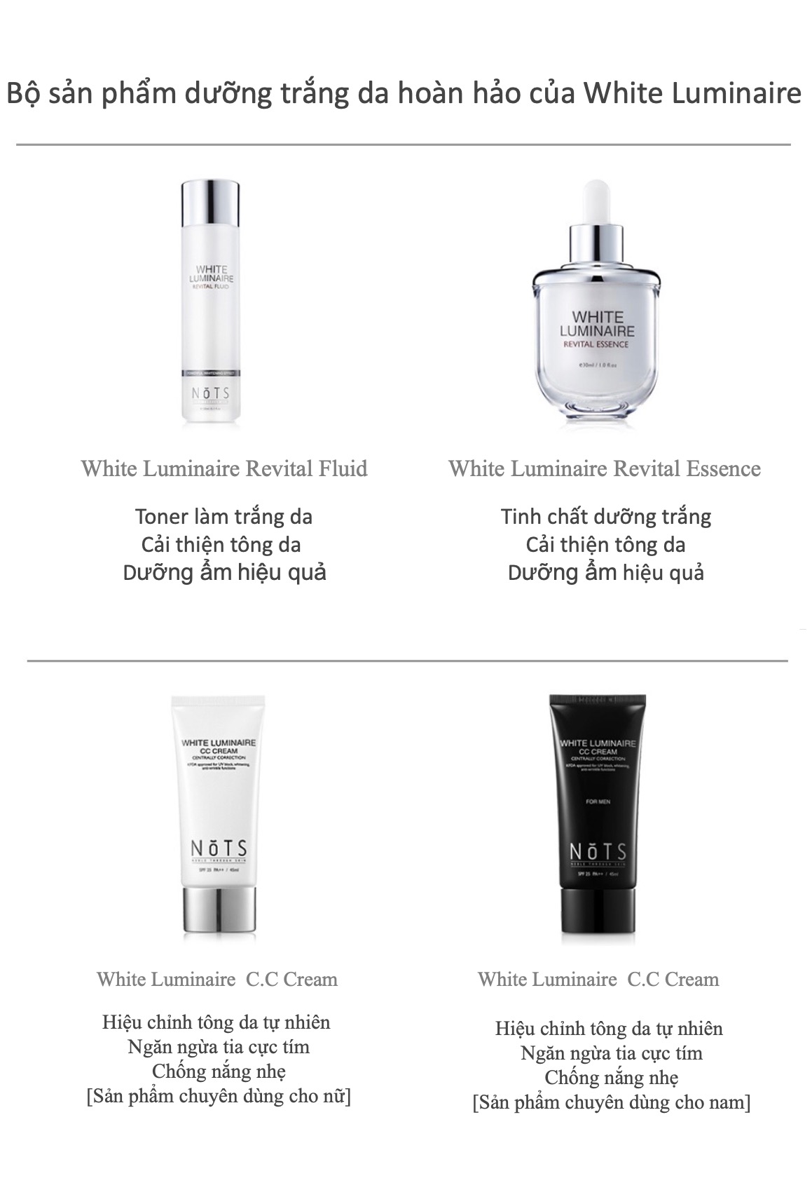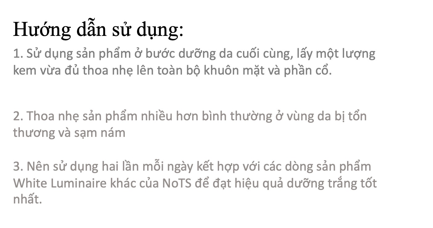 Kem dưỡng ẩm đặc trị làm trắng da NoTS White Luminaire Spot Correcting Cream là sản phẩm thuộc dòng dưỡng trắng và làm mịn da White Luminaire độc đáo với hỗn hợp nước thần chiết xuất từ hoa hồng trắng, cam thảo và trà xanh - công thức duy nhất chỉ có trong các sản phẩm của NoTS có tác dụng làm trắng, tái tạo sức sống mới cho làn da và duy trì độ ẩm cho da suốt cả ngày dài.