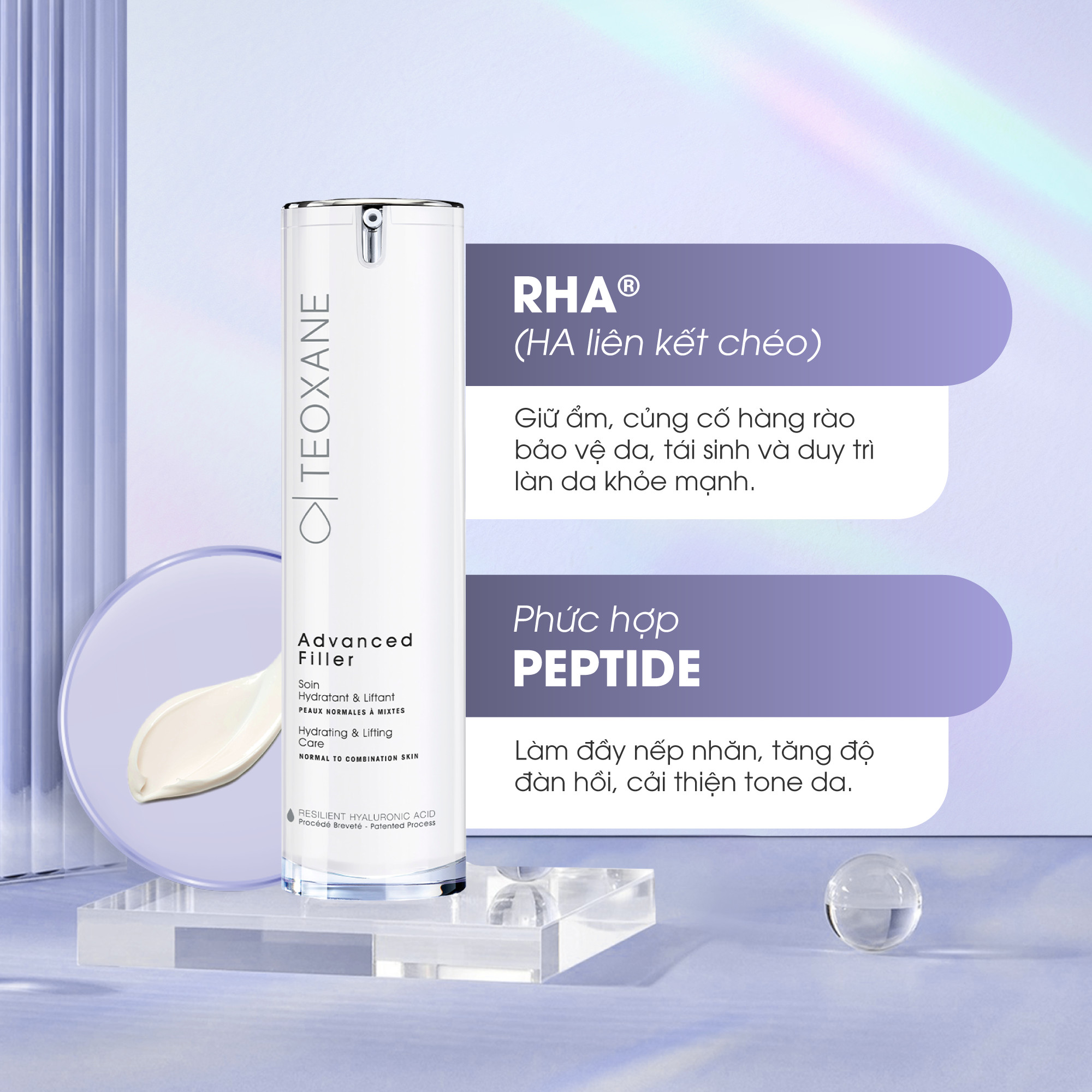 CÔNG THỨC CỐT LÕI Sự kết hợp giữa các hoạt chất có tác dụng hiệp đồng nhằm mang lại đáp ứng tối ưu cho các vấn đề lão hóa da RHA : Resilient Hyaluronic Acid CỦNG CỐ HÀNG RÀO BẢO VỆ DA VÀ DƯỠNG ẨM KÉO DÀI ĐEM LẠI SỨC SỐNG MỚI VÀ BẢO VỆ DA NovHyal : Các thành phần tự nhiên của Hyaluronic Acid KÍCH THÍCH VÀ TÁI TẠO HYALURONIC ACID TỰ NHIÊN CỦA CƠ THỂ Teoxane Advanced Filler Liệu pháp chăm sóc da lý tưởng cho ban ngày: Công thức giữ ẩm tối ưu với các hoạt chất chống nếp nhăn mạnh mẽ cho làn da đầy đặn và đàn hồi hơn. Công thức chuyên biệt cho 2 loại da: Da khô và Da thường/ Da hỗn hợp. Không gây cảm giác nhờn, dính và bóng dầu Hướng dẫn sử dụng: Thoa lên mặt và vùng cổ, vào buổi sáng và/hoặc tối, có thể sử dụng riêng hoặc sau khi sử dụng RHA Serum
