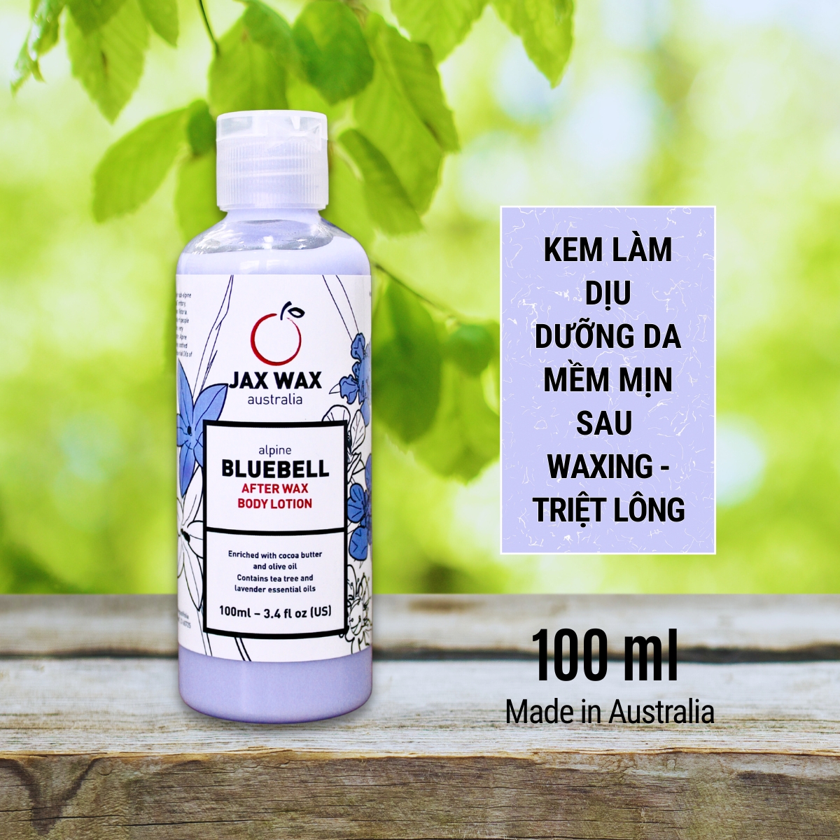 Kem dưỡng sau wax lông Jax Wax Australia Bluebell 100ml Xuất xứ: Úc (hàng chính hãng Jax Wax Australia nhập khẩu, có đầy đủ giấy công bố, hoá đơn VAT) Dung tích: 100ml Chiết xuất