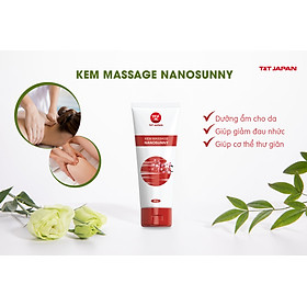 KEM MASSAGE JAVI'E NANOSUNNY   Công dụng: Kem massage JAVI'E NANOSUNNY, giúp dưỡng ẩm cho da, mang lại làn da mềm mại đồng thời giúp cơ thể thư giãn. Thành phần: Aqua, Methyl Salicylate, Menthol, Glycerin, Stearyl
