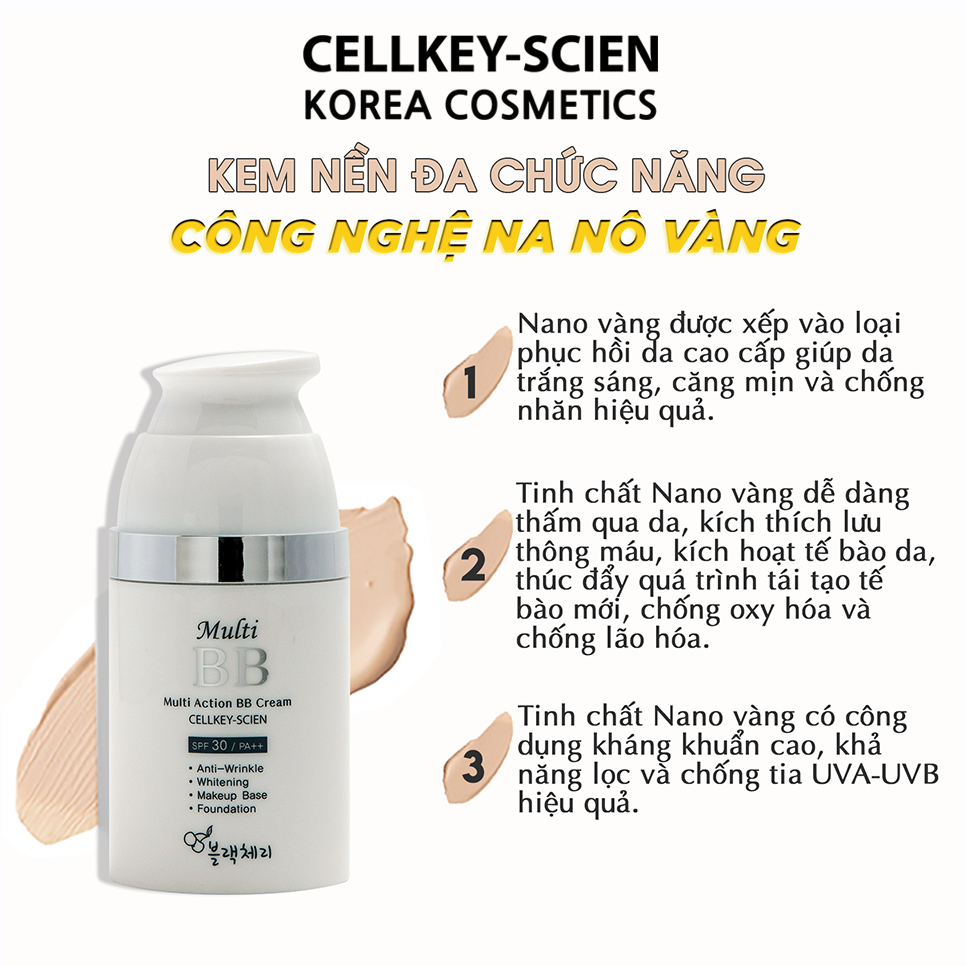 Mua tại TiktokKem Nền Che Khuyết Điểm Kiềm Dầu Chống Nắng Dưỡng Da Ngăn Ngừa Lão Hóa Công nghệ NANO Vàng Cellkey-Scien Multi Action BB Cream với những ưu điểm vượt trội!