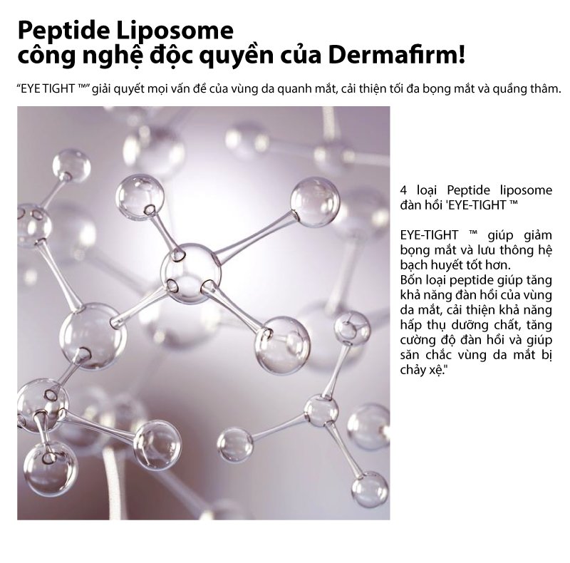 - EYE-TIGHT : Peptide độ tinh khiết cao tự sản xuất của Dermafirm áp dụng công nghệ liposome đàn hồi được hấp thụ tốt, tạo ra hiệu quả nhanh hơn và tức thì hơn để cải thiện quầng thâm và quầng mắt và độ đàn hồi. EYE-TIGHT có thể tăng khả năng hấp thụ hơn 200% so với các thành phần hoạt chất không bao bọc bởi liposome, giúp giải quyết các vấn đề về da quanh mắt nhanh chóng hơn.