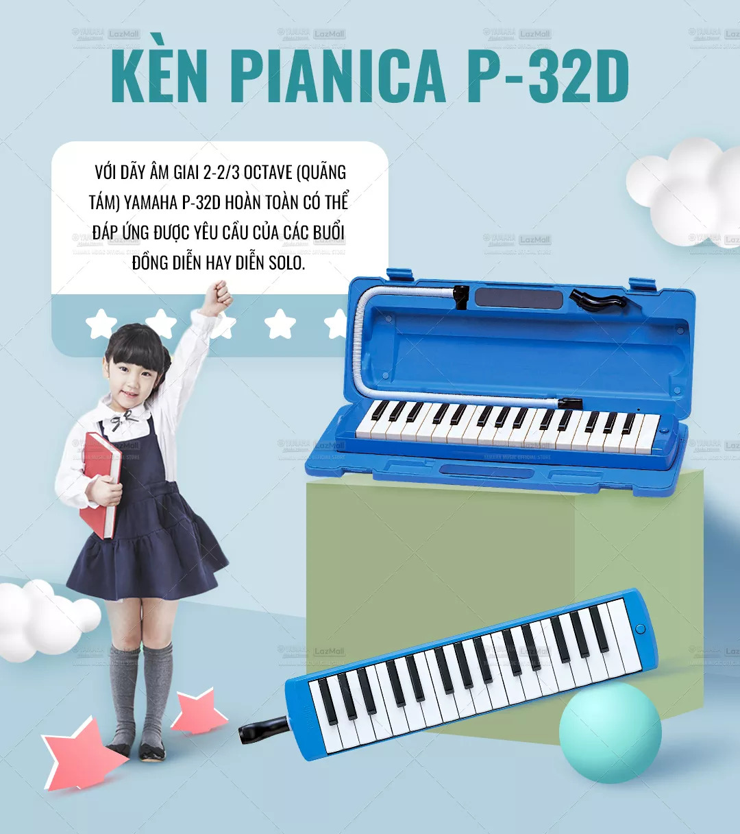 Mua tại TiktokKèn Pianica Yamaha P-32D Kèn Pianica Yamaha P-32D - Dãy âm giai 2-2/3 octave (quãng tám) của model này thích hợp cho các buổi đồng diễn hay biểu diễn solo. Những người chơi chuyên nghiệp