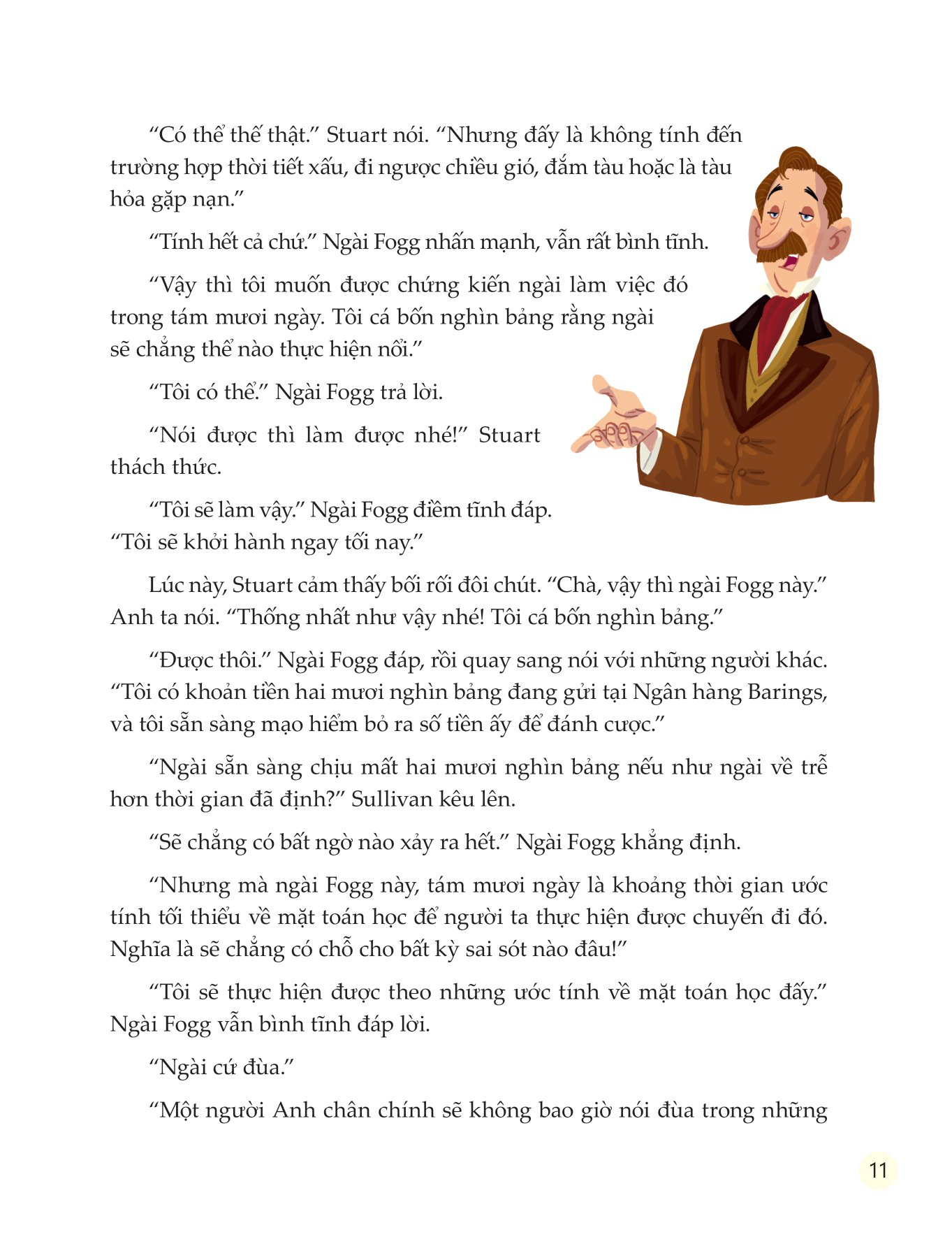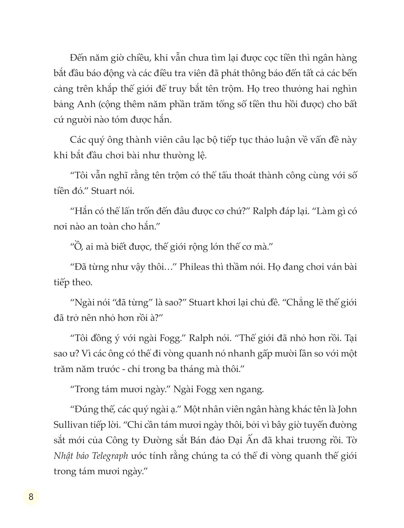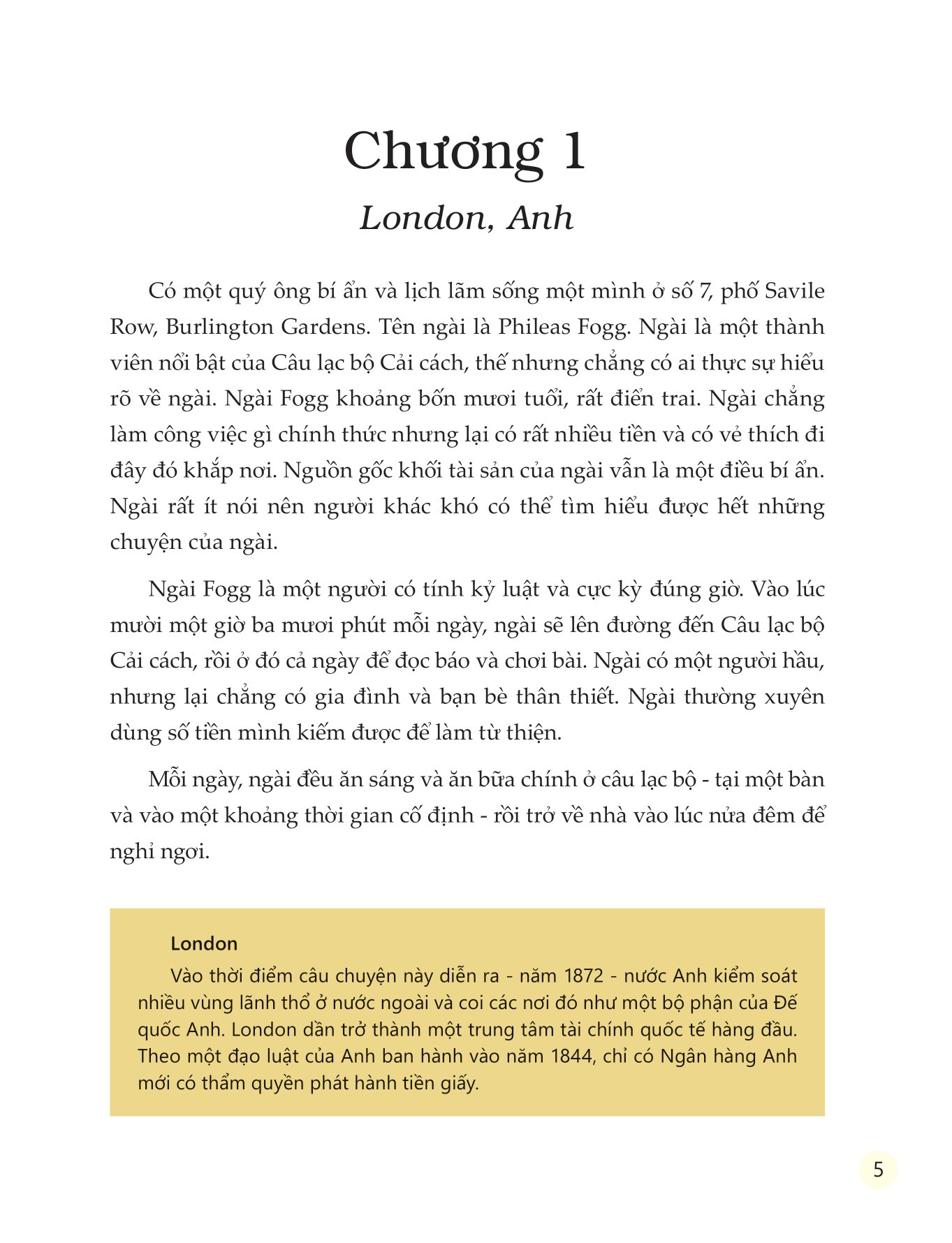 Vào ngày mùng Hai tháng Mười năm 1872, ngài Phileas Fogg đã cho người hầu của mình nghỉ việc vì cậu ta mắc lỗi chuẩn bị nước cạo râu nóng 28,9oC thay vì 30oC cho ngài. Hôm đó, có một người hầu mới đến thay. Người này tự giới thiệu mình là một người Pháp, tên là Jean Passepartout. Anh chàng giải thích rằng họ của mình (tạm dịch là “đa năng”) đã mô tả chính xác khả năng đảm nhận nhiều công việc khác nhau của bản thân. Từ diễn viên xiếc cho đến nhân viên cứu hỏa, anh chàng đều làm được hết. Sau đó, Phileas lại lên đường đến Câu lạc bộ Cải cách.