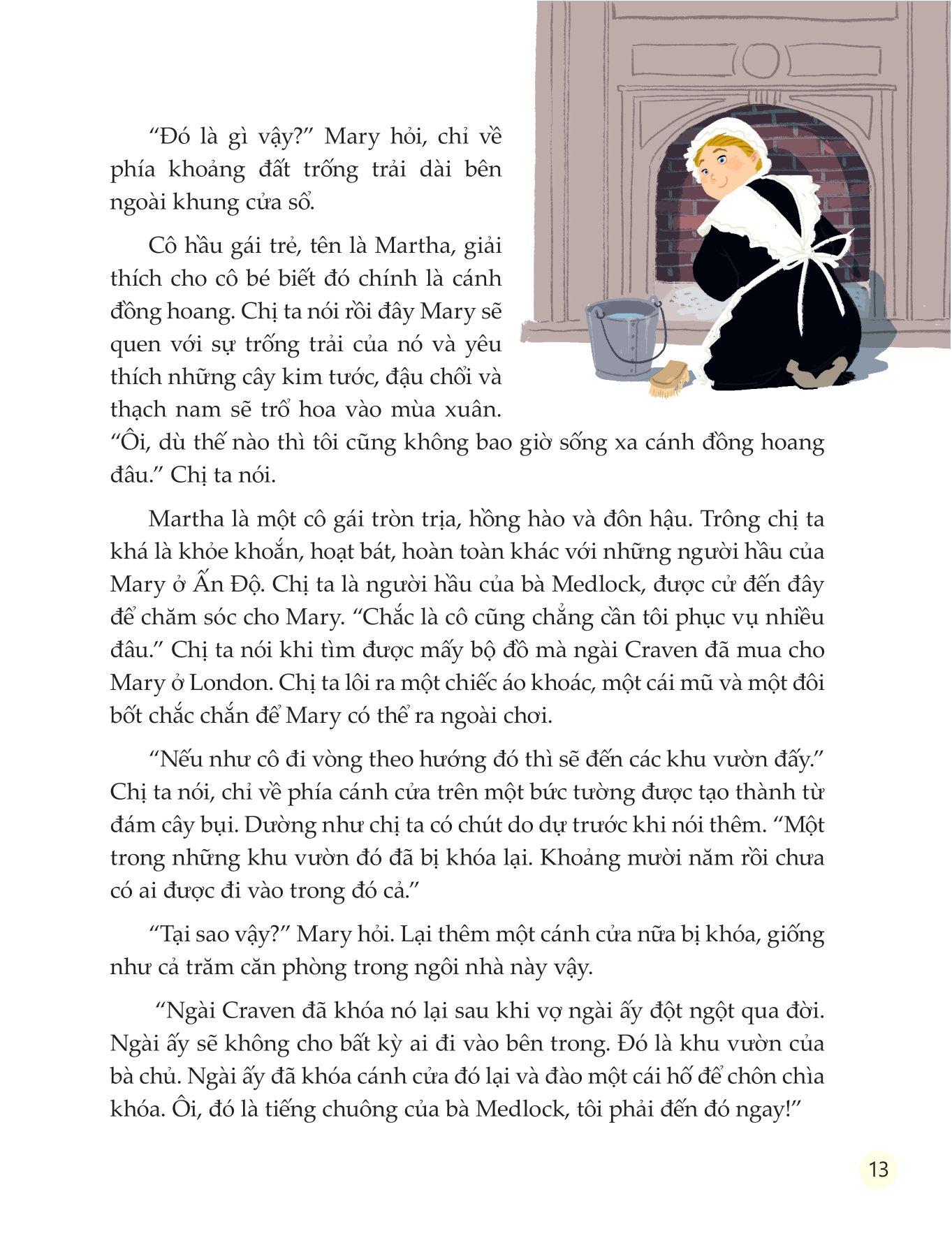 Mọi người đều nói Mary Lennox có vẻ ngoài chẳng ai ưa nổi, cái mặt gầy choắt còn biểu cảm thì cau có, khó gần. Mary sinh ra ở Ấn Độ. Cha của cô bé làm việc cho chính phủ Anh, còn mẹ cô bé là một phụ nữ vô cùng xinh đẹp, có điều dường như họ chẳng hề bận tâm đến việc nuôi dạy đứa con gái nhỏ của m.ình. Lúc nào Mary cũng ở cùng bảo mẫu và bị tách xa khỏi cha mẹ hết mức có thể. Mẹ của Mary không thích nghe thấy tiếng khóc của con gái m.ình, cho nên những người hầu trong nhà luôn cố gắng chiều theo mọi yêu cầu của cô bé. Bởi thế mà chẳng có gì đáng ngạc nhiên khi lớn lên, cô bé lại trở thành một đứa trẻ ích kỷ.