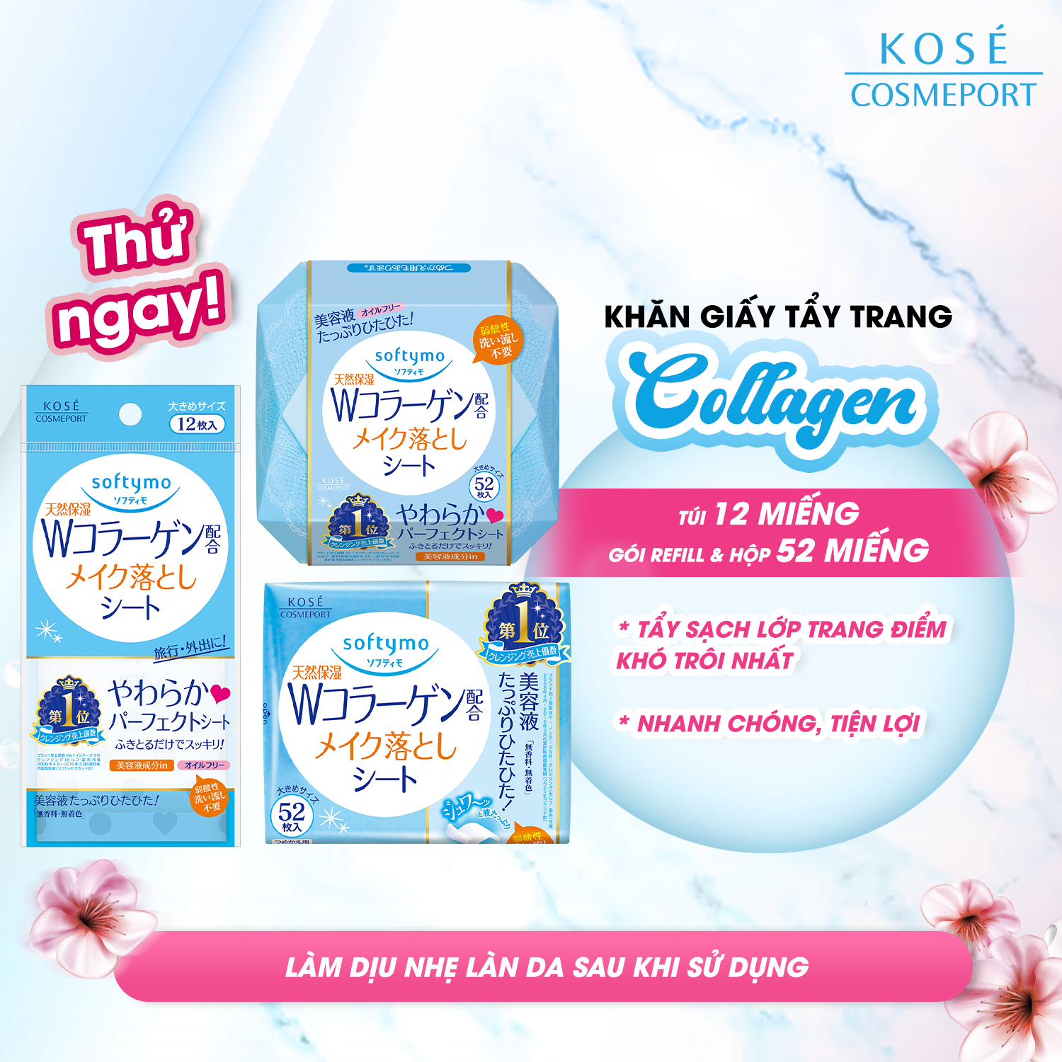 Khăn Giấy Tẩy Trang Dưỡng Ẩm Bổ Sung Collagen Kosé Softymo Cleansing Sheet C (52 Miếng) Thương hiệu: Kosé Xuất xứ: Nhật Bản Công dụng 5 in 1 tiện lợi: Tẩy trang, rửa mặt, làm