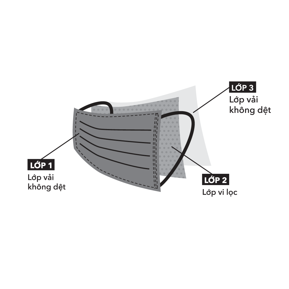 Thành phần - Các lớp vải gồm: lớp ngoài, lớp thứ hai và lớp trong là lớp vải không dệt, lớp thứ ba là lớp vi lọc. - Dây thun đeo tai. - Thanh nẹp
