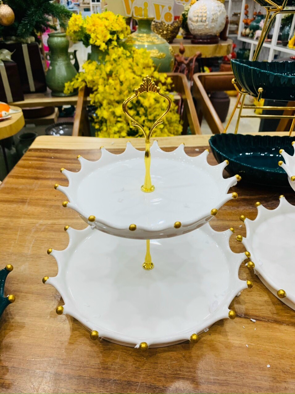 Khay sứ viền vàngđựng bánh kẹo 2 tầng sang trọng. Phù hợp sử dụng trong gia đình, cửa hàng và khách sạn. Thiết kế sang trọng và bắt mắt nhất hiện nay. Chất liệu: Khay