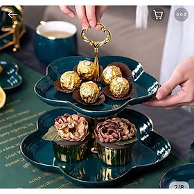 ✨KHAY ĐỰNG BÁNH KẸO HOA QUẢ SỨ XANH CỔ VỊT 2 TẦNG HÌNH VIỀN SÓNG