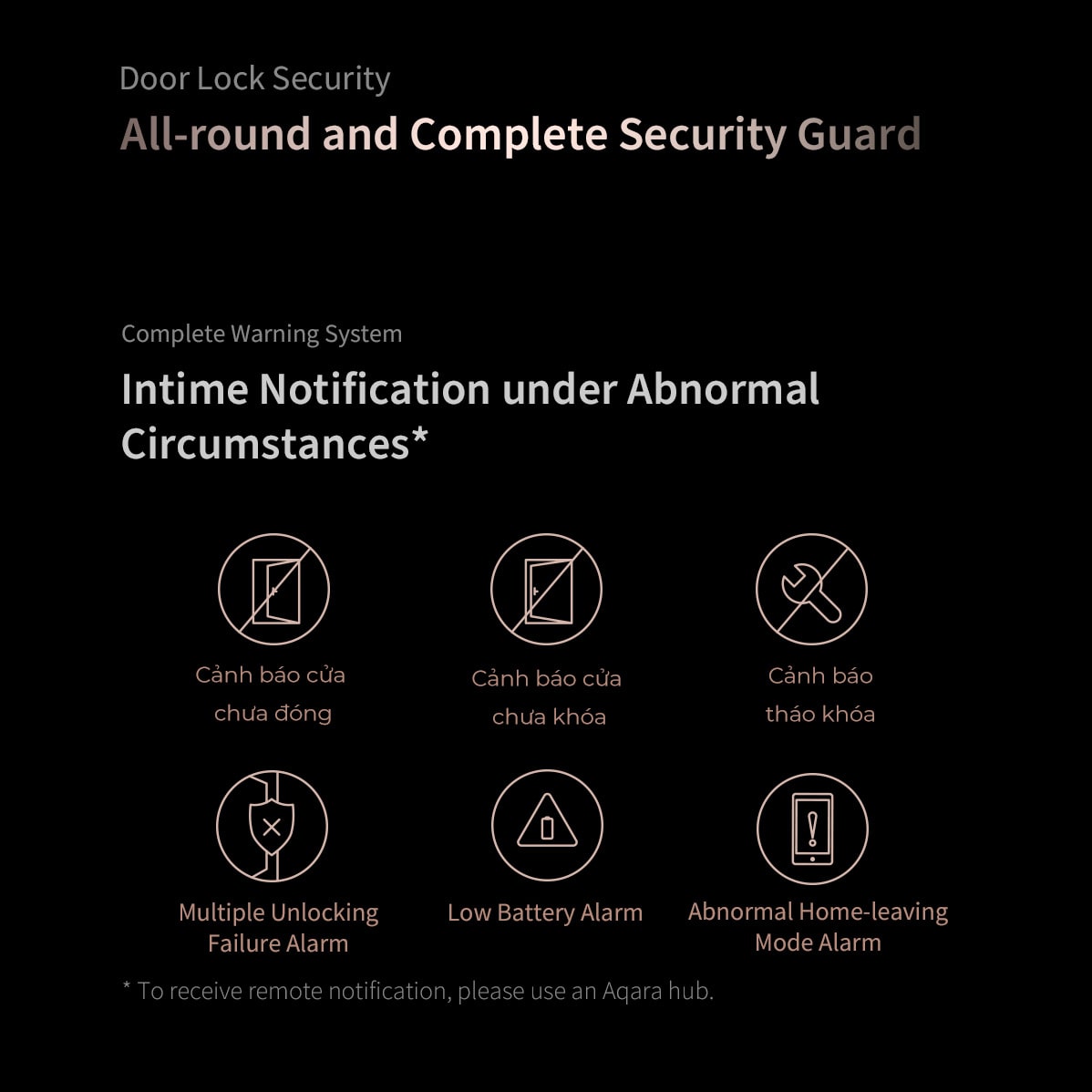 - Tính năng tương thích Zigbee 3.0 và Bluetooth 5.0 Khóa thông minh hoàn toàn tự động Tương tự dòng Aqara D100 Smart Lock, Aqara D200i cũng là khóa tự động với các chốt sẽ tự động bật ra khi cửa được khép lại. Khóa được thiết kế với nhiều bu lông khóa, an toàn và mạnh mẽ. Đặc biệt Aqara D200i sử dụng xilanh khóa loại C – cao cấp nhất trong tiêu chuẩn lõi chống trộm cơ học. Khi cửa chưa đóng hoặc khép hờ khóa sẽ phát ra âm thanh cảnh báo và gửi ngay notification về ứng dụng cho người dùng (yêu cầu Aqara Hub). Thiết kế thời thượng Thiết kế gọn gàng chính là ấn tượng dễ nhận thấy nhất của khóa Aqara D200i. Phần tay cầm cách điệu nằm dọc theo thân khóa, bạn chỉ cần xác thực khuôn mặt hoặc sử dụng bất kỳ cách mở khóa nào được hỗ trợ thì khóa sẽ ngay lập tức tự động mở ra mà không cần phải dùng lực vặn tay nắm như thông thường. Tay cầm màu vàng đồng kết hợp với thân khóa màu đen giúp mang đến cảm giác thời thượng và tinh tế cho không gian.