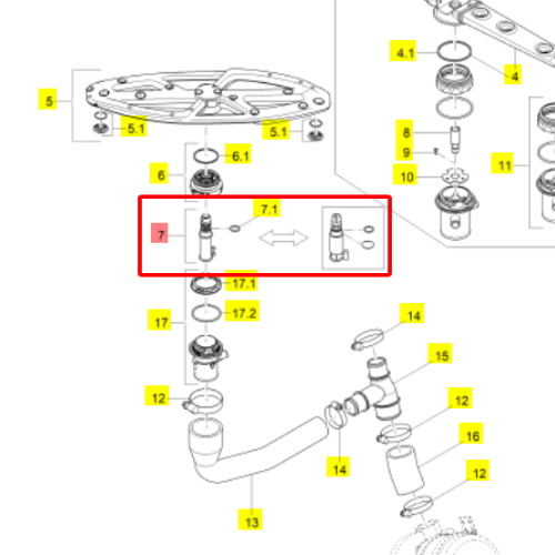Tay quay phun rửa - 60003520, chỉ áp dụng cho các máy rửa chén Winterhalter P50-V2, có số serial máy từ 41991653 trở về trước đó. Chức năng: tay quay này có 6 vòi phun