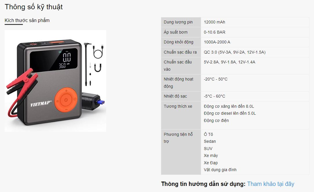 Sở hữu dung lượng Pin lên đến 12000mAh cùng dòng khởi động 1000A - 2000A tương thích 99% các dòng xe cá nhân Sedan; SUV hiện tại trên thị trường bao gồm xe điện, xe động cơ dầu diesel lên đến 5.0L, xe động cơ xăng lên đến 8.0L. Bơm Lốp Kích Bình VIETMAP 4 trong 1 là giải pháp tốt nhất cho mọi trường hợp xe bị cạn bình, chết máy, cần kích ắc quy mà không cần câu điện từ xe khác hay chờ cứu hộ. Thao tác dễ dàng, kích bình ắc quy nhanh chóng