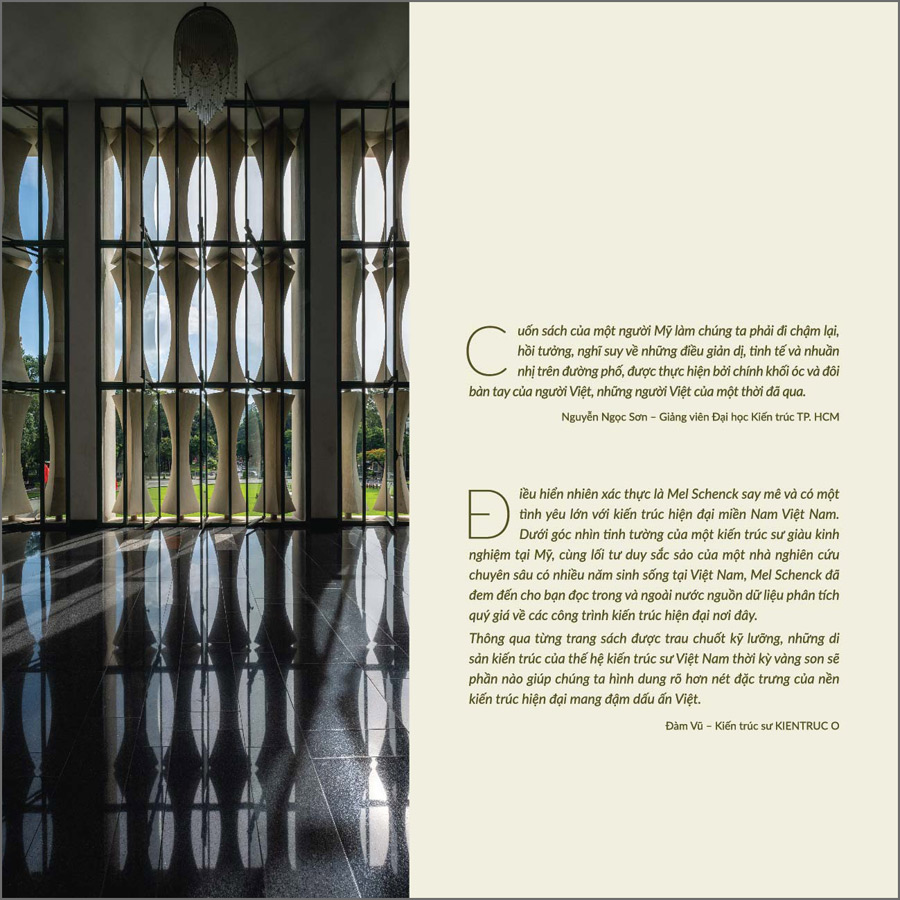 “Điều hiển nhiên xác thực là Mel Schenck say mê và có một tình yêu lớn với kiến trúc hiện đại miền Nam Việt Nam. Dưới góc nhìn tinh tường của một kiến trúc sư giàu kinh nghiệm tại Mỹ, cùng lối tư duy sắc sảo của một nhà nghiên cứu chuyên sâu có nhiều năm sinh sống tại Việt Nam, Mel Schenck đã đem đến cho bạn đọc trong và ngoài nước nguồn dữ liệu phân tích quý giá về các công trình kiến trúc hiện đại nơi đây.