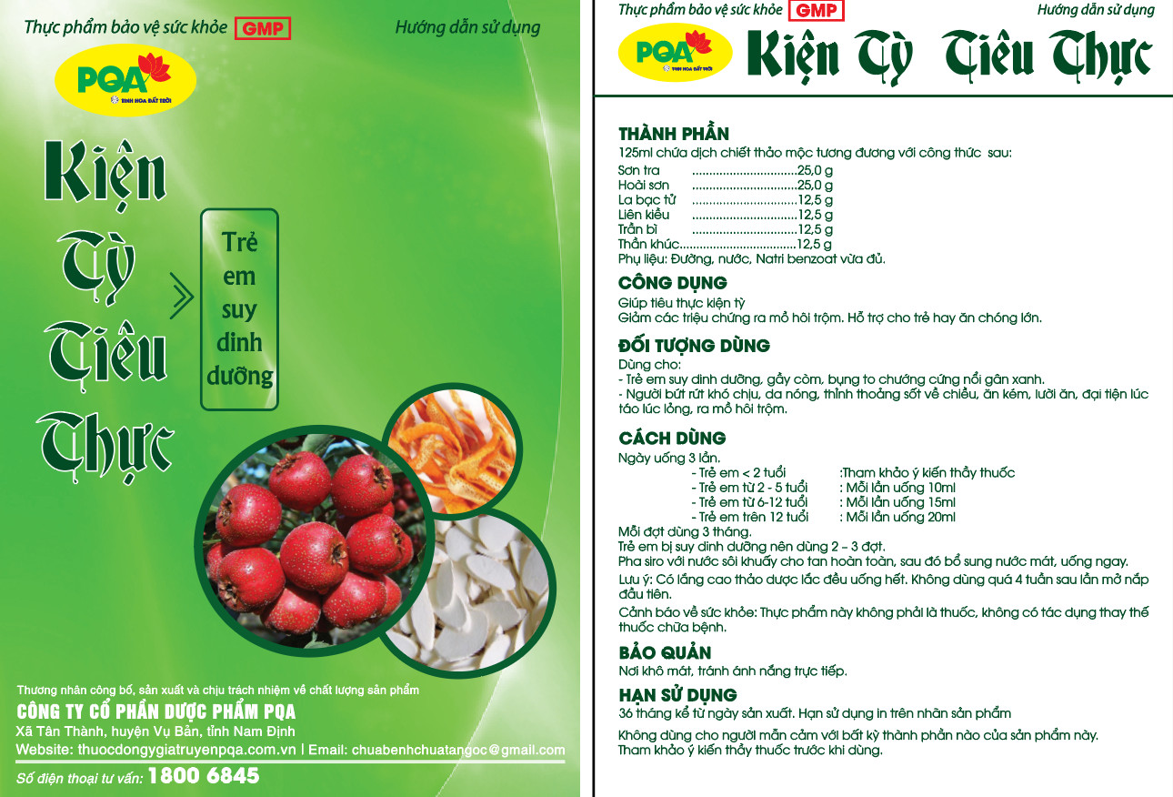- Địa chỉ sản xuất: Công ty Cổ phần Dược phẩm PQA. Thửa 99, Khu Đồng Quàn, Xã Tân Thành, Huyện Vụ Bản, Tỉnh Nam Định. THÀNH PHẦN: