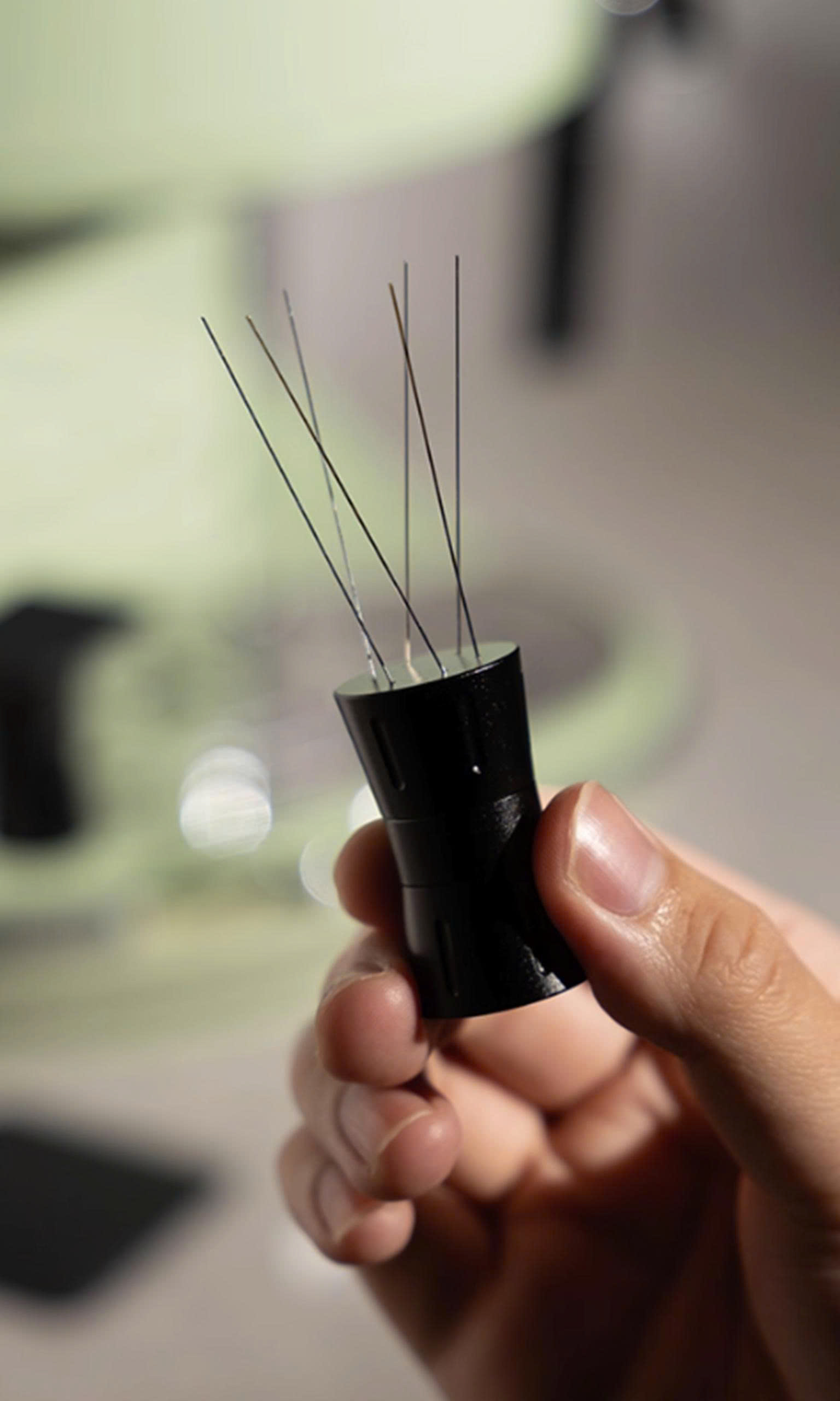 Sản phẩm được thiết kế dạng núm vặn bằng hợp kim nhôm sơn nhám. Cảm giác cầm rất chắc chắn và vừa tay. 8 thanh kim loại mỏng có độ dẻo và có thể uốn cong len lõi đánh tơi đến mọi nơi bên trong bánh cà phê. Khi bột được đánh tơi sẽ giúp phần tamping tốt hơn rất nhiều, áp suất nước sẽ chiết xuất đều hơn.