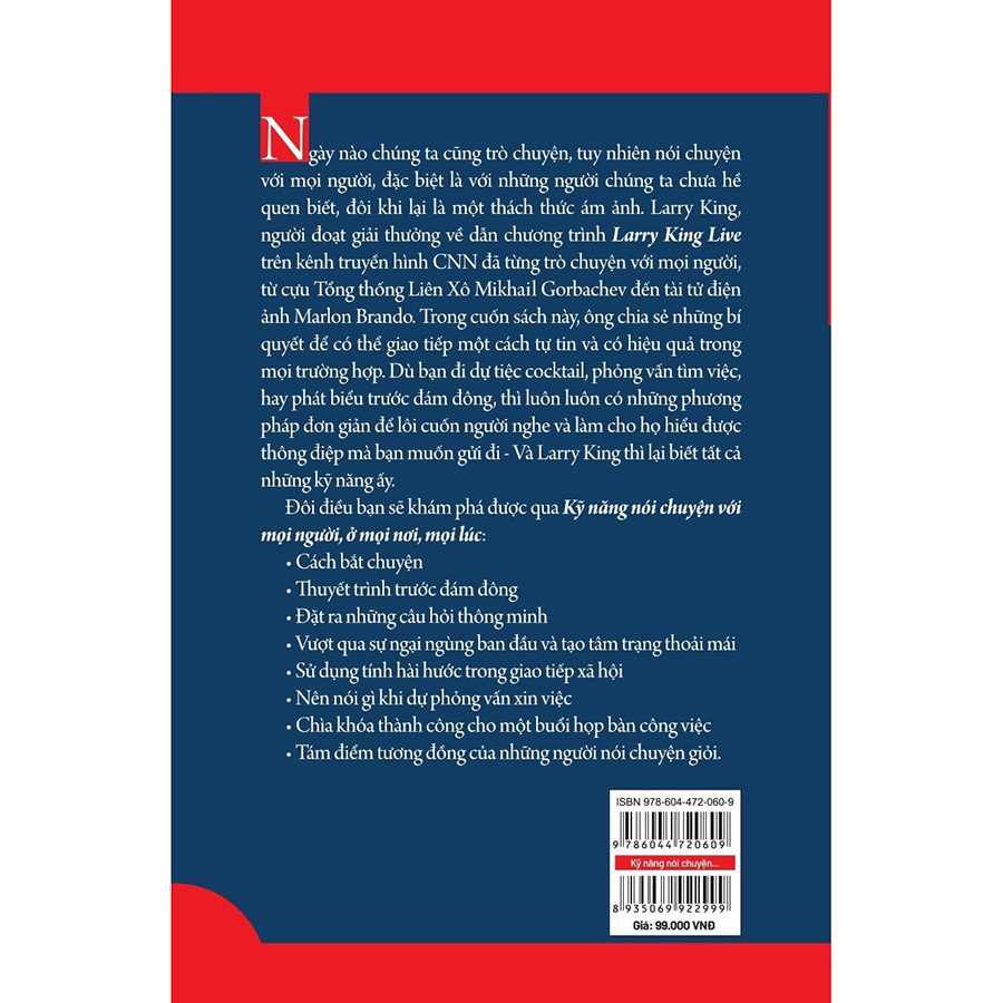 Kỹ Năng Nói Chuyện Với Mọi Người Ở Mọi Nơi, Mọi Lúc là cuốn sách rất có sức thuyết phục về nghệ thuật giao tiếp, được đúc kết từ sự nghiệp hơn ba mươi năm trong ngành phát thanh và truyền hình của Larry King, người dẫn chương trình rất có ảnh hưởng trên kênh truyền hình CNN, Mỹ. Tác giả viết lại một cách giản dị, trên cơ sở những sự kiện, trải nghiệm có thật, để rút ra những bí quyết đơn giản nhưng hiệu quả trong giao tiếp trong nhiều bối cảnh khác nhau, giúp người đọc có thể nói chuyện với bất cứ ai, vào bất cứ thời điểm nào, tại bất cứ nơi nào. Ngoài ra, cuốn sách còn nhằm giúp người đọc liên tục trau dồi khả năng giao tiếp, trở thành người nói chuyện ngày càng có duyên hơn.