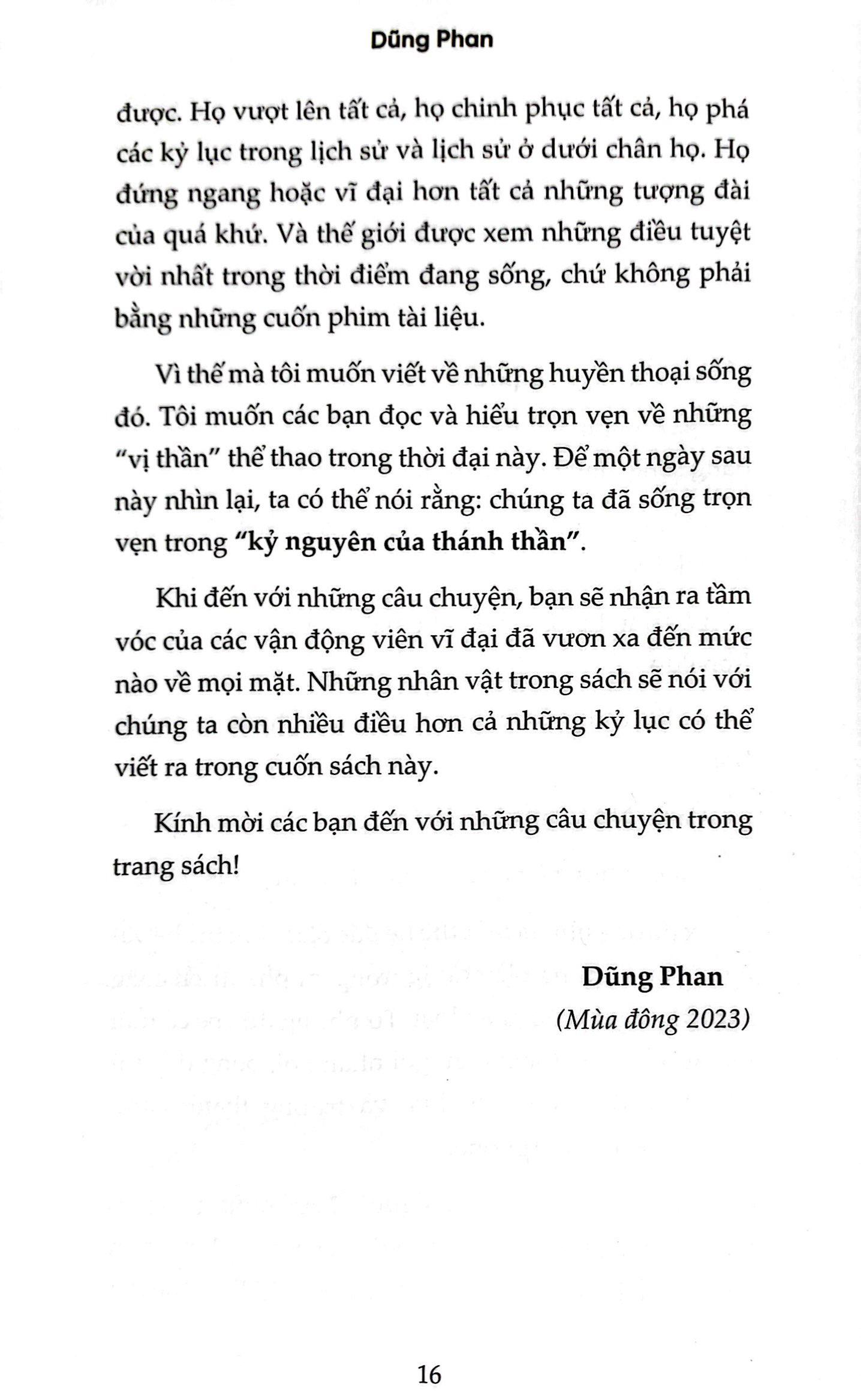 Vì thế mà tôi muốn viết về những huyền thoại sống đó. Tôi muốn các bạn đọc và hiểu trọn vẹn về những “vị thần” thể thao trong thời đại này. Để một ngày sau này khi nhìn lại, ta có thể nói rằng: chúng ta đã sống trọn vẹn trong “kỷ nguyên của thánh thần”.