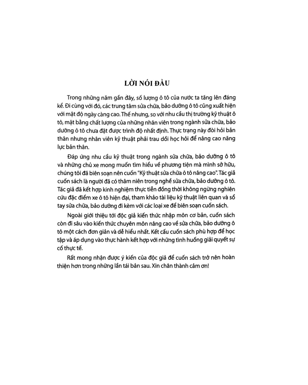 Kỹ thuật sửa chữa ô tô nâng cao Căn cứ vào nhu cầu nâng cao tay nghề hiện nay, Huy Hoàng trân trọng giới thiệu tới bạn đọc cuốn sách Kỹ thuật sửa chữa ô