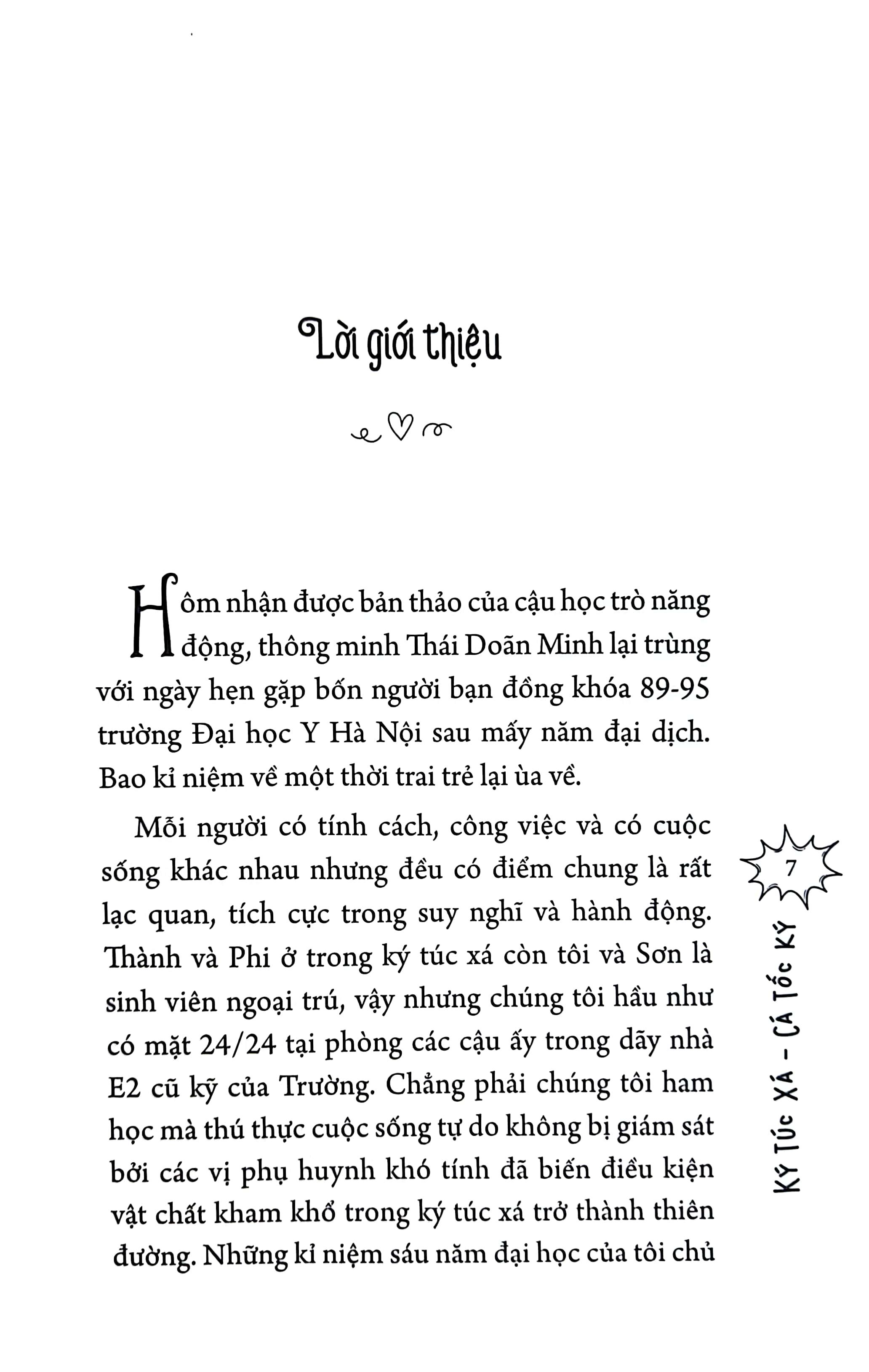 Phần lớn những lời giới thiệu sẽ do tác giả cuốn sách mời đọc và xin đôi dòng cảm nhận với tư cách là những độc giả đầu tiên, nhưng lời giới thiệu này được viết ra do tôi đi “xin xỏ” tác giả mà có. Ngay từ khi Minh Cá lên ý tưởng viết một cuốn sách về cuộc sống ký túc xá - nơi chúng tôi có 6 năm gắn bó, tôi đã chủ động đề nghị: “Cậu ạ! Sau này tôi sẽ viết lời giới thiệu cho cuốn sách nhé? Nếu cậu thấy không ưng, tôi xin phép tự in và đóng vào cuốn sách của cậu xem như phần phụ lục hoặc hiệu đính vậy”.