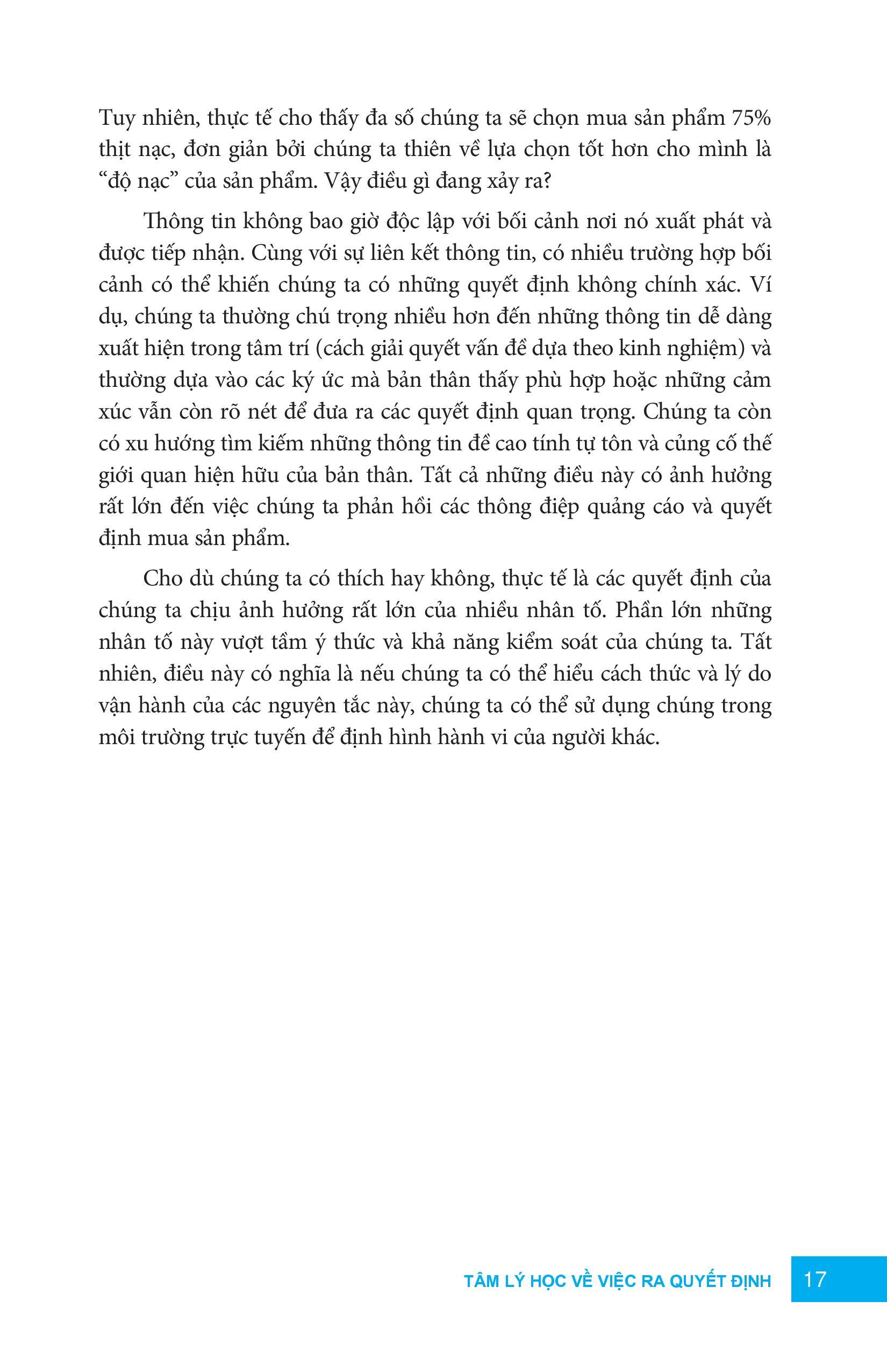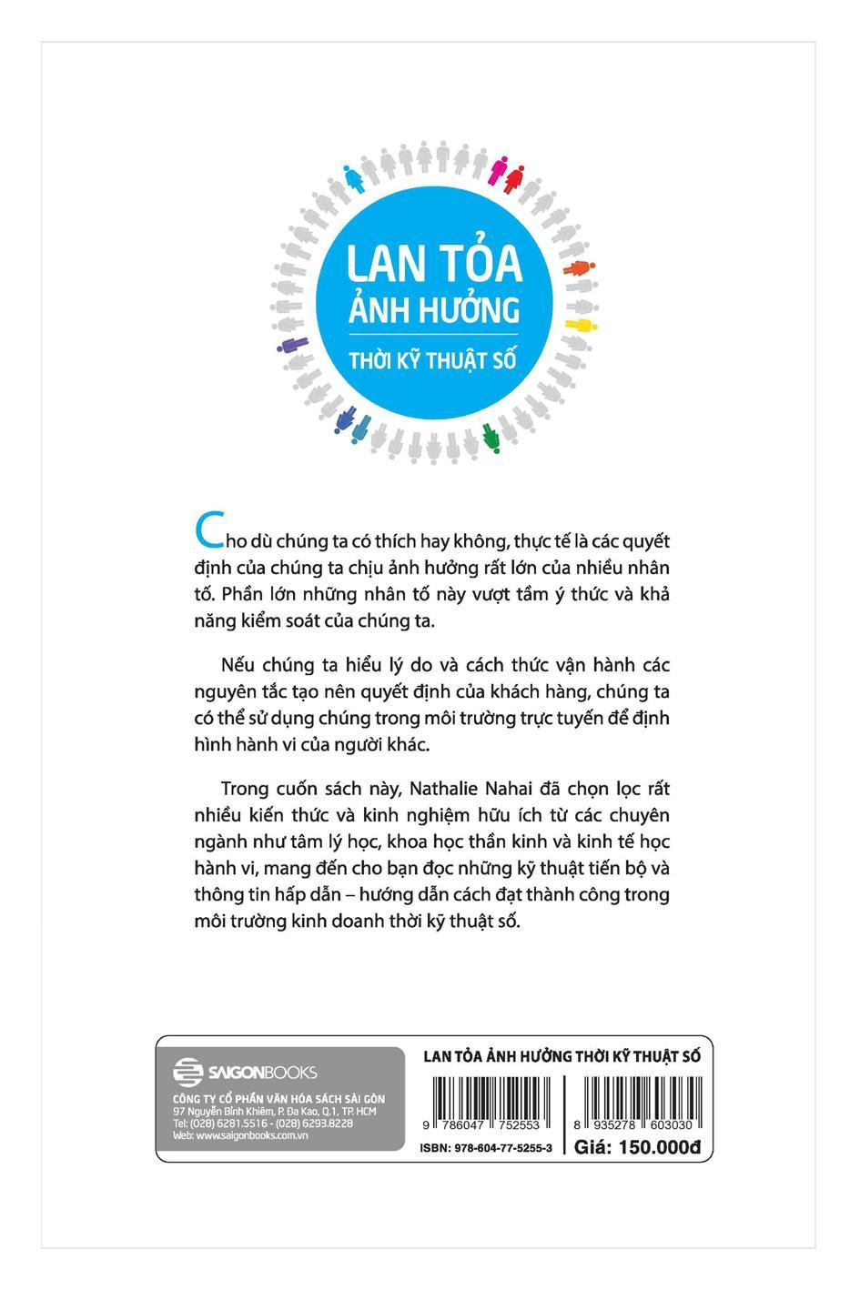 Mua tại TiktokCho dù chúng ta có thích hay không, thực tế là các quyết định của chúng ta chịu ảnh hưởng rất lớn của nhiều nhân tố. Phần lớn những nhân tố này vượt tầm ý thức và khả năng kiểm soát của chúng ta. Nếu chúng ta hiểu lí do và cách thức vận hành các nguyên tắc tạo nên quyết định của khách hàng, chúng ta có thể sử dụng chúng trong môi trường trực tuyến để định hình hành vi của người khác. Trong Lan tỏa ảnh hưởng thời kỹ thuật số, Nathalie Nahai đã chọn lọc rất nhiều kiến thức và kinh nghiệm hữu ích từ các chuyên ngành như tâm lý học, khoa học thần kinh và kinh tế học hành vi, mang đến cho bạn đọc những kỹ thuật tiến bộ và thông tin hấp dẫn – hướng dẫn cách đạt thành công trong môi trường kinh doanh thời kỹ thuật số.