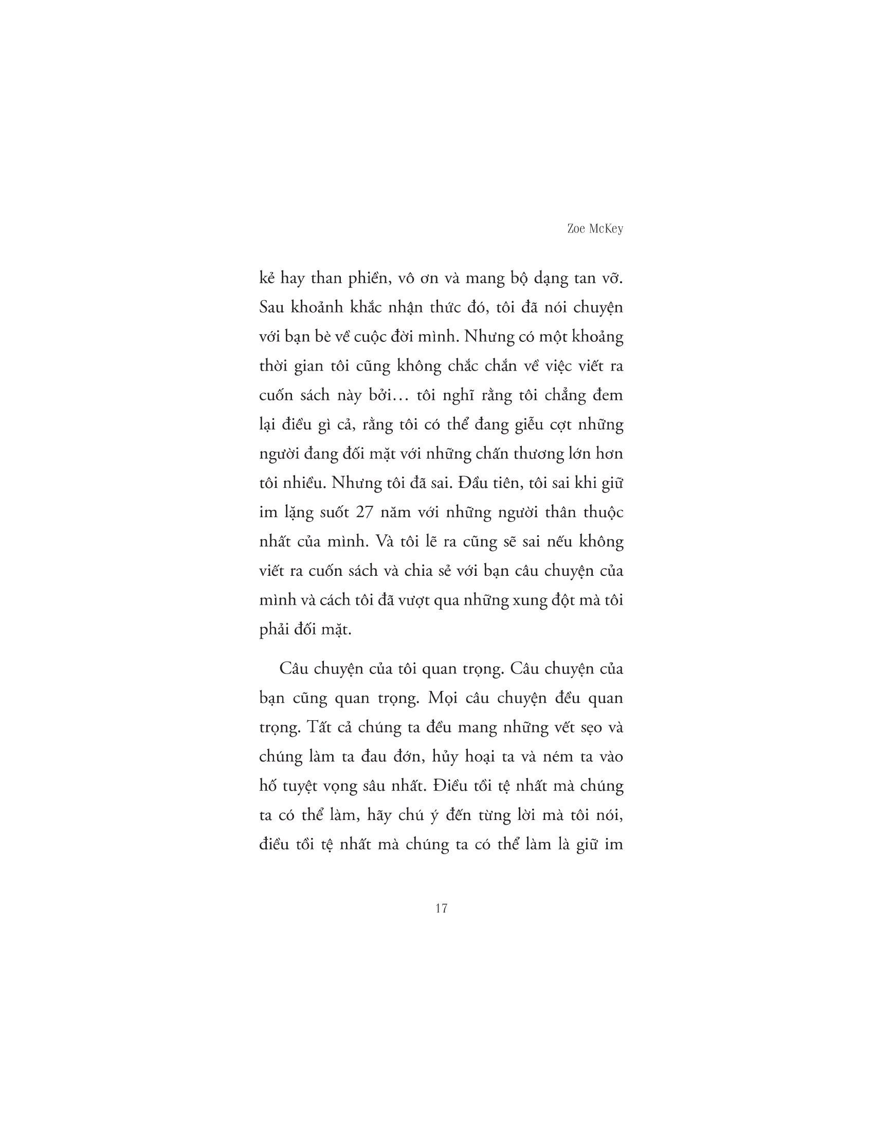 Lắng Nghe Đứa Trẻ Bên Trong Thấu hiểu cảm xúc để yêu thương, chữa lành tổn thương để hạnh phúc Sự trưởng thành không phải là một điểm đến mà là một hành trình. Hành trình khám phá bản thân, nhìn nhận những gì bạn làm và cảm nhận. Sự trưởng thành là quá trình bạn tìm kiếm ý nghĩa cho cuộc sống của m.ình những giá trị và mục tiêu quan trọng. Bạn biết cách cân bằng giữa công việc và cuộc sống, giữa việc chăm sóc bản thân và quan tâm đến người khác. Bạn biết cách yêu thương và được yêu thương. Từ đó có thể tạo ra những mối quan hệ chân thành và bền vững. Tuy vậy, trưởng thành luôn đi kèm những đánh đổi và tổn thương, cho dù chúng ta đã cố gắng phớt lờ hay lãng quên thì đứa trẻ ở nơi sâu thẳm tâm hồn vẫn sẽ ghi nhớ kĩ lưỡng từng chút một. Và những tổn thương ấy đều không có vết sẹo nào chảy máu cả. Dẫu vậy nó vẫn đề lại trong tâm trí mỗi người một nét vẽ nghệch ngoạc. Cuốn sách “Lắng nghe đứa trẻ bên trong bạn” sẽ giúp bạn thấu hiểu cảm xúc, quay về với chính m.ình để yêu thương và chữa lành. Cuốn sách nhấn mạnh giá trị thực sự của bản thân bạn, học hỏi những kỹ năng để trở nên tự tin, cải thiện các mối quan hệ và cởi bỏ sự non nớt về mặc cảm xúc. Cuộc đời này là của bạn, vì thế đừng cầm bản đồ của người khác để dò đường đi của m.ình. Bạn có quyền quyết định cách bạn muốn sống. Hãy tìm ra sự can đảm của m.ình. Hãy sống một cách đích thực. Hãy bảo vệ bản thân và những gì quan trọng với bạn. Hãy phá kén, tỏa sáng theo cách riêng của m.ình. Khi chúng ta hành động dựa trên tiền đề của nhận thức và hành động dựa trên những giá trị tốt nhất của bản thân mình (thay vì nỗi sợ hãi, lo lắng và thiếu sót), chúng ta sẽ làm chủ vận mệnh của mình. Bởi chúng ta có quyền kiểm soát nó. Về tác giả: Zoe McKey là tác giả bán chạy nhất trên Amazon cũng đồng thời là một nhà khai vấn giao tiếp, lối sống. Cô được hàng triệu độc giả săn đón nhờ những tư duy và nghệ thuật giao tiếp, bí quyết phát triển bản thân tuyệt vời đã được cô chia sẻ thông qua những cuốn sách của m.ình và qua blog cá nhân. Trong thời gian vài năm trở lại đây, Zoe McKey bắt đầu viết lách, tập trung cho tình yêu cuộc sống và chia sẻ nó lại qua những cuốn sách. Những diễn giải của Zoe McKey trong sách sẽ giúp bạn đọc tìm ra được lý do để họ sống theo cách của riêng m.ình, luôn có một lời giải thích cho hành vi của bạn mà chính bạn cũng không nhận ra. Đọc sách Zoe McKey sẽ giúp bạn khai phá trí óc và hành động theo một cách mới để không ngừng tốt hơn trong cuộc sống.