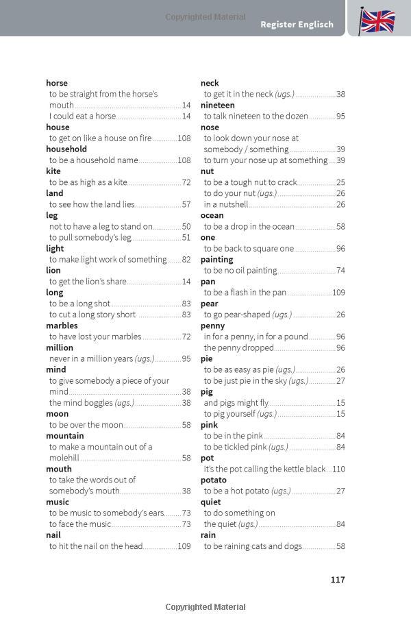 Jede Redewendung mit wörtlicher und idiomatischer Übersetzung sowie einem Anwendungsbeispiel