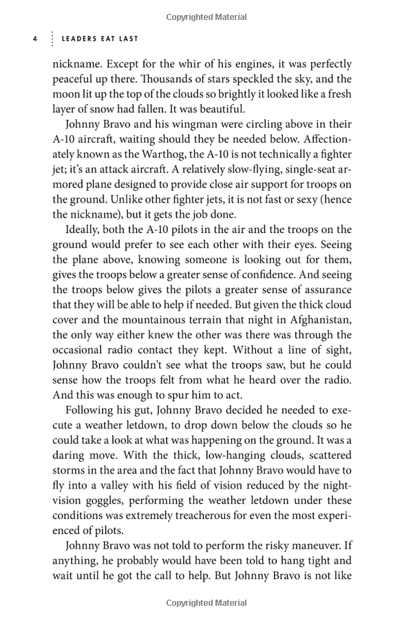 As in Start with Why, Sinek illustrates his ideas with fascinating true stories, from the military to manufacturing, from government to investment banking. He shows that leaders who are willing to eat last are rewarded with deeply loyal colleagues who will stop at nothing to advance their vision. It's amazing how well it works.