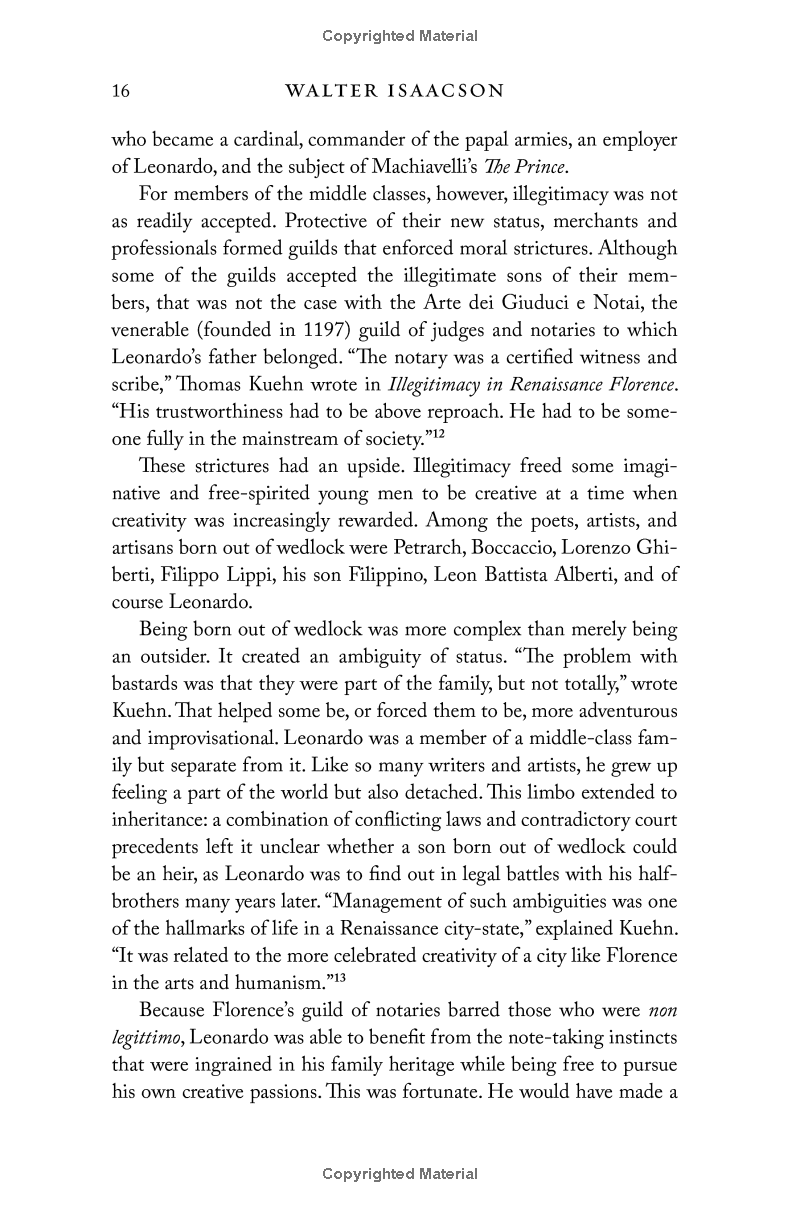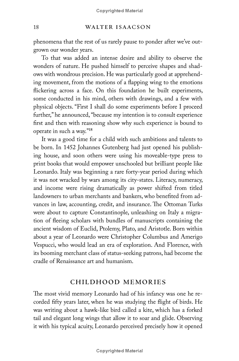 Leonardo’s delight at combining diverse passions remains the ultimate recipe for creativity. So, too, does his ease at being a bit of a misfit: illegitimate, gay, vegetarian, left-handed, easily distracted, and at times heretical. His life should remind us of the importance of instilling, both in ourselves and our children, not just received knowledge but a willingness to question it—to be imaginative and, like talented misfits and rebels in any era, to think different.