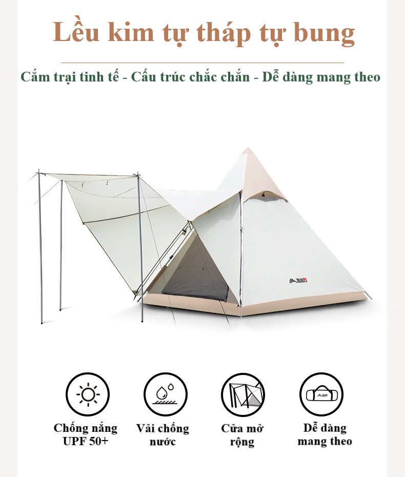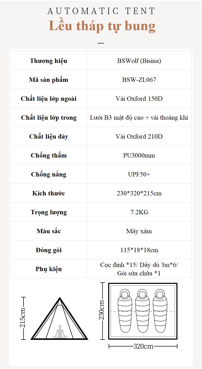 THÔNG TIN SẢN PHẨM: - Tên sản phẩm: Lều tháp tự bung - Mã sản phẩm: BSW-ZL067 - Chất liệu lớp ngoài: Vải Oxford 150D, PU3000mm,UPF50+ - Chất liệu lớp trong: Lưới B3+ vải thoáng