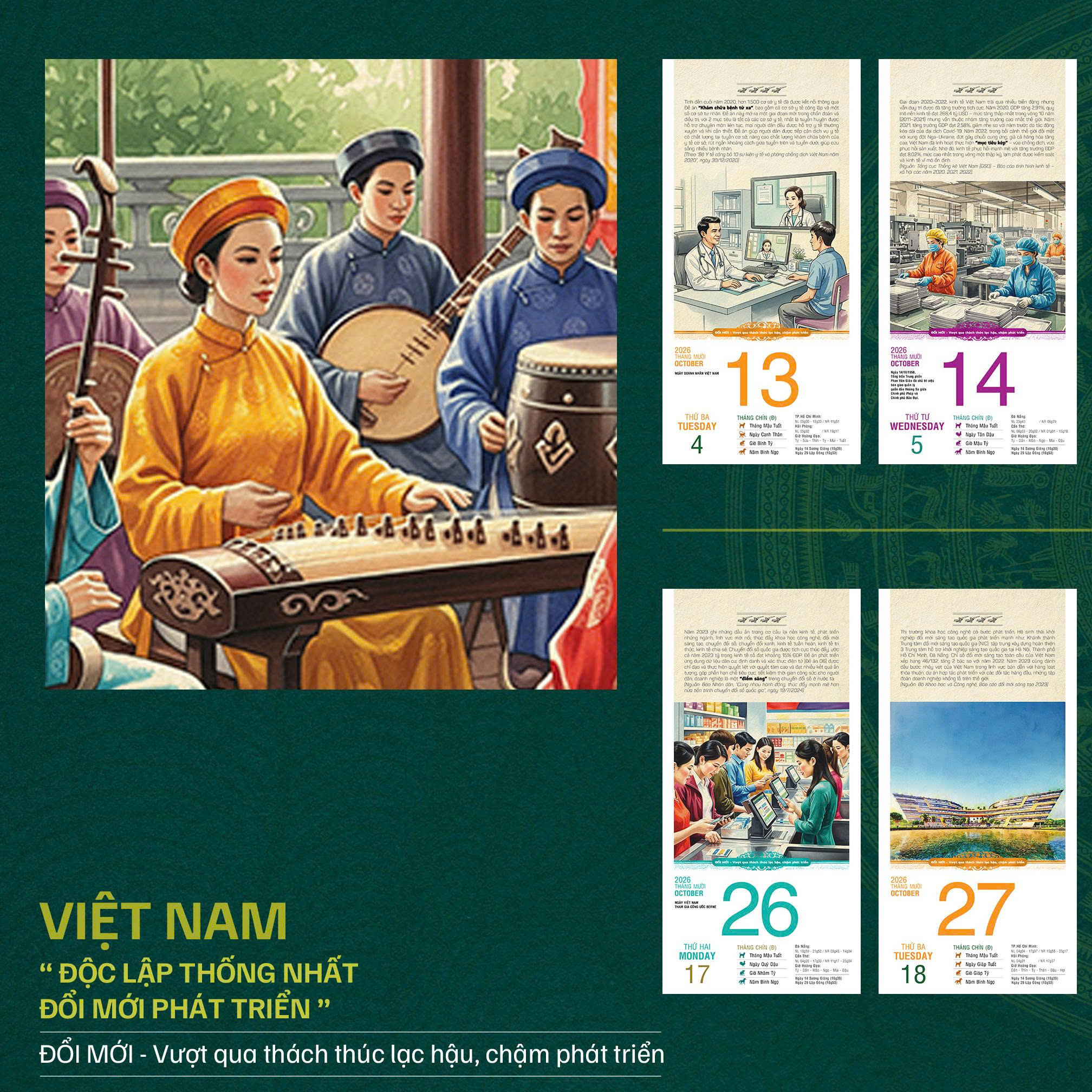 - PHÁT TRIỂN – Tăng tốc, đột phá hướng đến mục tiêu xây dựng một nước Việt Nam phát triển, phồn vinh, hạnh phúc. Khởi nguồn từ quá trình dựng nước của các vua Hùng, cuộc khởi nghĩa oanh liệt của Hai Bà Trưng, trải các triều đại Đinh, Lê, Lý, Trần, Nguyễn cho đến ngày nay, lịch sử Việt Nam là bản anh hùng ca bất tận về tinh thần yêu nước, ý chí độc lập và khát vọng tự do mãnh liệt. Tinh thần ấy được kết tinh trong ba áng hùng văn bất hủ: "Nam quốc sơn hà", "Bình Ngô đại cáo", và "Tuyên ngôn Độc lập" – Những bản tuyên ngôn thiêng liêng khẳng định nền độc lập, khí phách ngàn đời của dân tộc Việt. Trải qua chiến tranh, chia cắt, rồi hòa bình lập lại, Việt Nam bước vào công cuộc Đổi mới với tinh thần dấn thân và khát vọng vươn lên. Từ một đất nước nghèo nàn, lạc hậu, Việt Nam từng bước chuyển mình, đạt mức thu nhập trung bình cao và đang hướng đến mục tiêu trở thành quốc gia phát triển có thu nhập cao vào năm 2045. Mỗi trang lịch là một lát cắt lịch sử sống động, được thể hiện sinh động qua những bức tranh đa sắc độ – kết quả lao động sáng tạo của nhóm họa sĩ. Quá trình minh họa công phu dựa trên việc tham khảo nhiều nguồn tài liệu: sách vở, hình ảnh tư liệu, báo chí, phim ảnh và cả gợi ý từ công nghệ trí tuệ nhân tạo (AI), nhằm mang đến một sản phẩm lịch vừa sâu sắc về nội dung, vừa giàu tính nghệ thuật. Chúng tôi kỳ vọng bộ lịch này sẽ được đón nhận tích cực từ các cơ quan Đảng, Nhà nước, các doanh nghiệp, cùng cộng đồng người Việt trong và ngoài nước. Đồng thời, đây cũng là tài liệu hữu ích dành cho nhà trường, giúp các em học sinh – sinh viên hiểu biết lịch sử, nuôi dưỡng lòng tự hào, tình yêu quê hương đất nước và khát vọng xây dựng tương lai.Với tất cả tâm huyết và trách nhiệm, những người thực hiện mong rằng bộ lịch không chỉ đơn thuần là công cụ ghi ngày tháng, mà còn là cầu nối ký ức – tri thức – cảm hứng cho mỗi người Việt trên hành trình hội nhập và phát triển. Trân trọng giới thiệu.