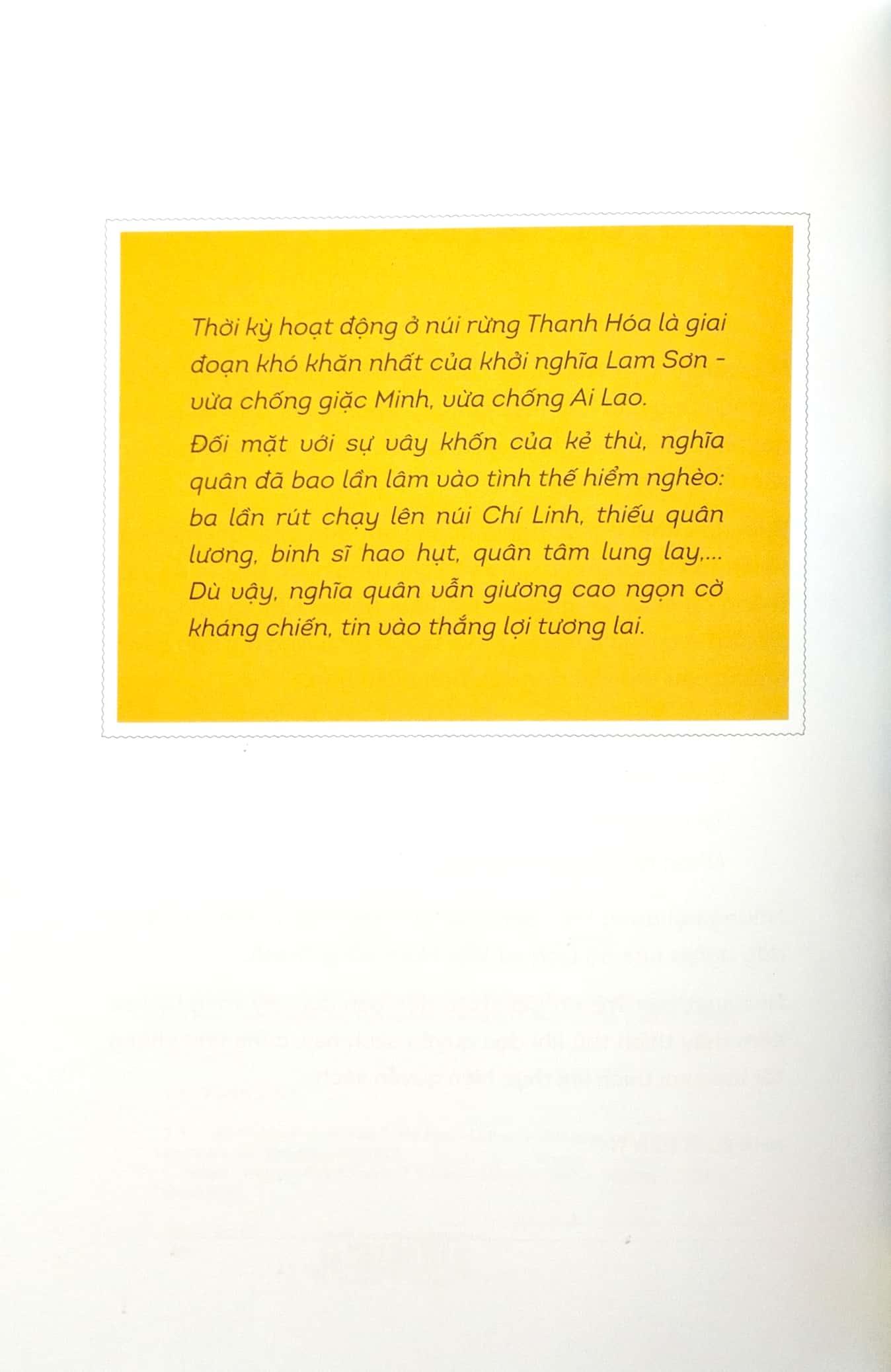 Thời kỳ hoạt động ở núi rừng Thanh Hóa là giai đoạn khó khăn nhất của khởi nghĩa Lam Sơn - vừa chống giặc Minh, vừa chống Ai Lao. Đối mặt với sự vây khốn của kẻ thù, nghĩa quân đã bao lần lâm vào tình thế hiểm nghèo: ba lần rút chạy lên núi Chí Linh, thiếu quân lương, binh sĩ hao hụt, quân tâm lung lay, Dù vậy, nghĩa quân vẫn giương cao ngọn cờ kháng chiến, tin vào thắng lợi tương lai.