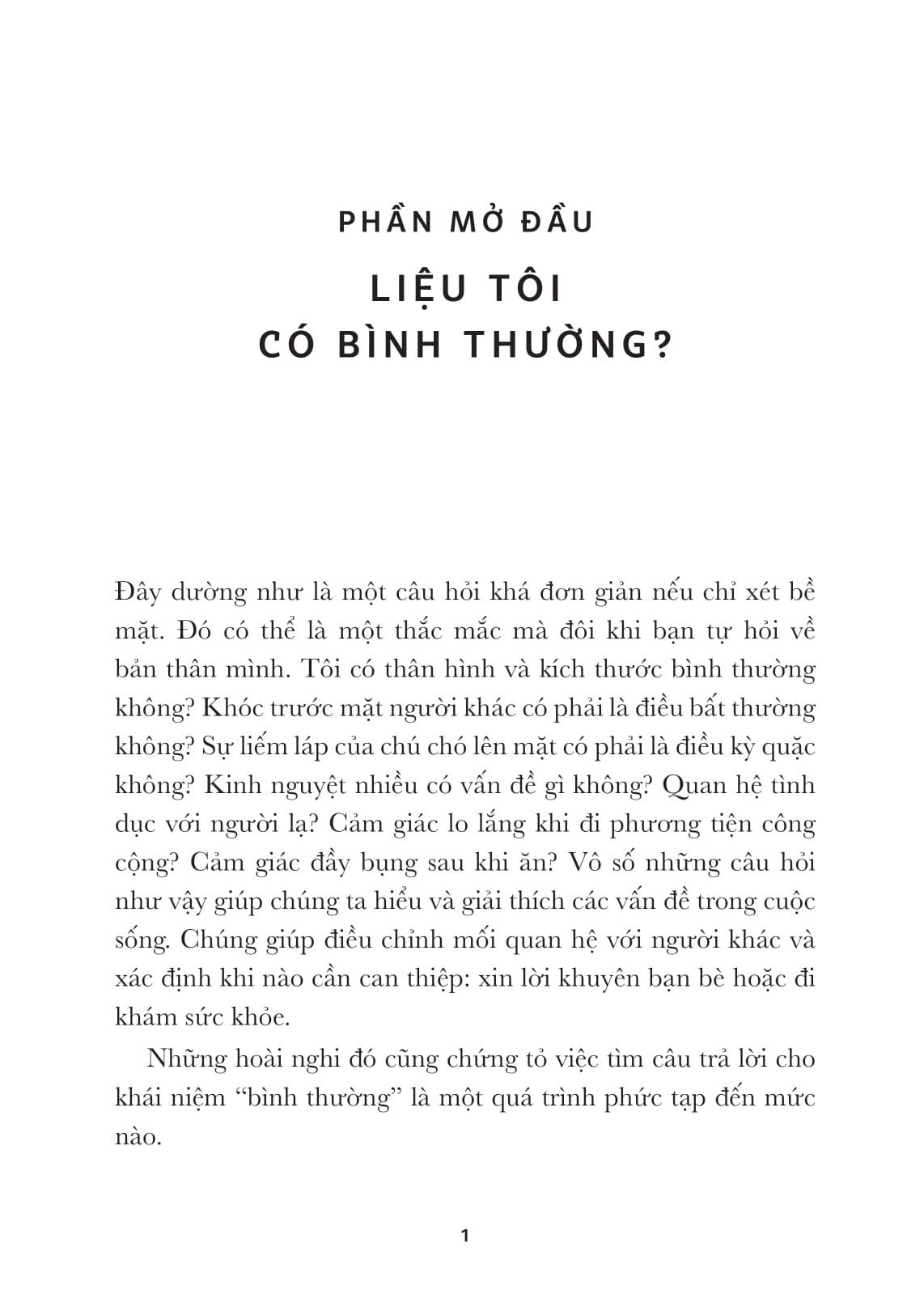 Các vấn đề đặt ra trong sách đều thú vị, đi từ giải thích thuật ngữ "bình thường" từ cổ chí kim đến các băn khoăn liệu cơ thể m.ình có bình thường? Tâm trí, đời sống tình dục, cảm xúc... của m.ình có bình thường chăng? Con của m.ình có bình thường, có giống hay bằng “con nhà người ta” không? Cả xã hội này có bình thường?
