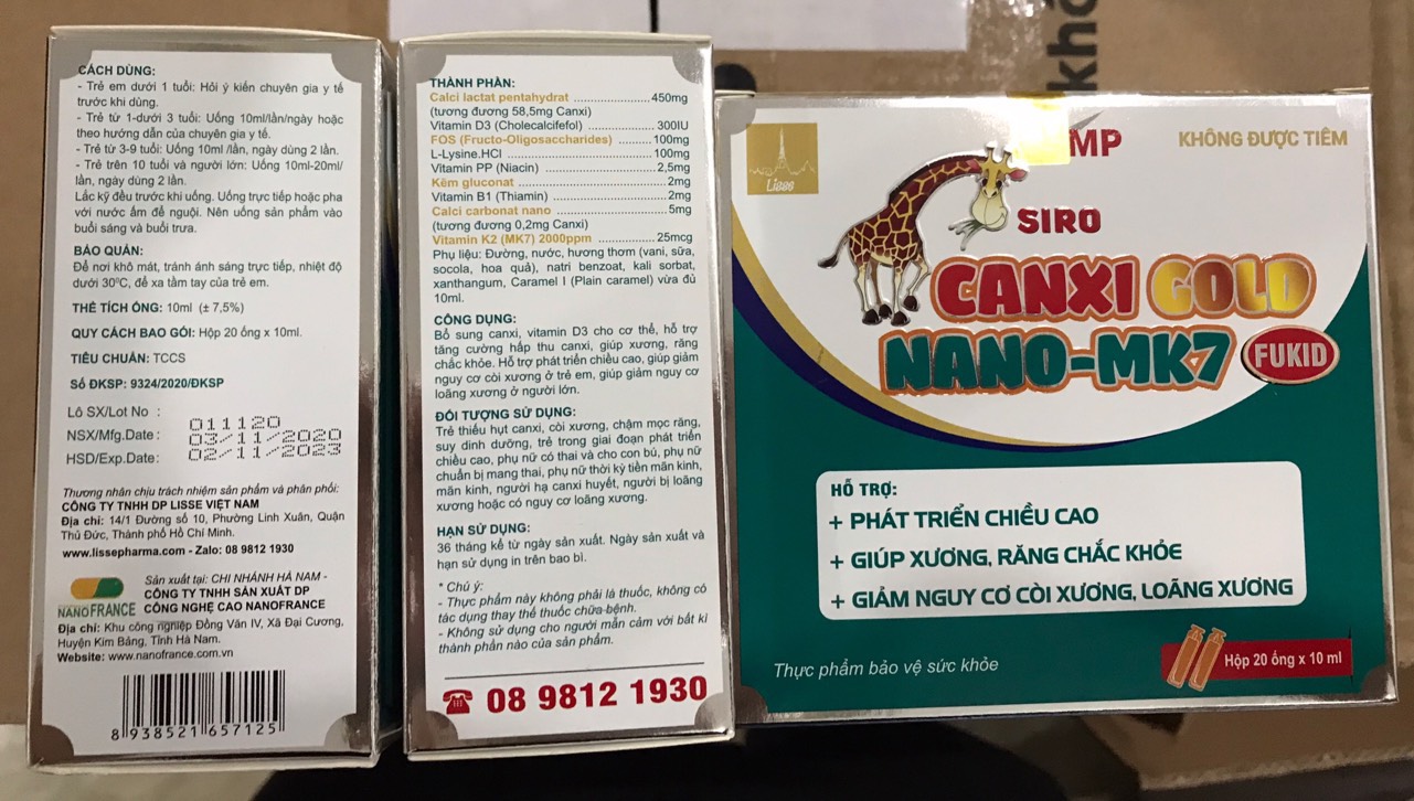 CANXI GOLD FUKID Thành phần: Canxi glucoheptonate .... 450mg; Vitamin D3 .. 300UI; L-Lysine HCl .... 300mg; Kẽm gluconate 2mg; Vitamin B1 .. 2mg; Vitamin PP .. 2,5mg; Vitamin K2 .. 25mcg; Fructose oligosaccharides (FOS)