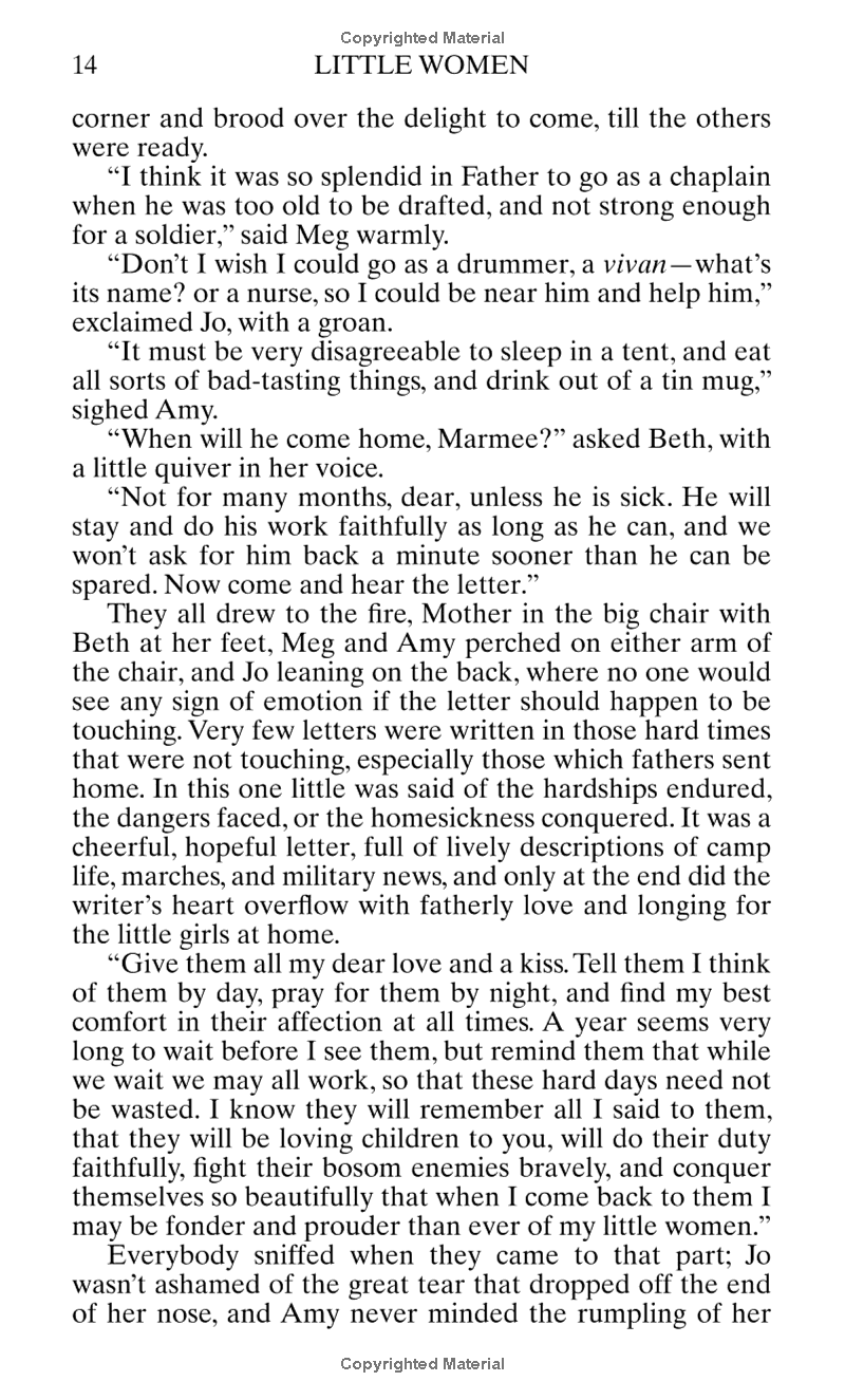 The four March sisters--Meg, Amy, Beth, and feisty Jo--share the joys and sorrows of growing up while their father is away at war. The family is poor in worldly goods, but rich in love and