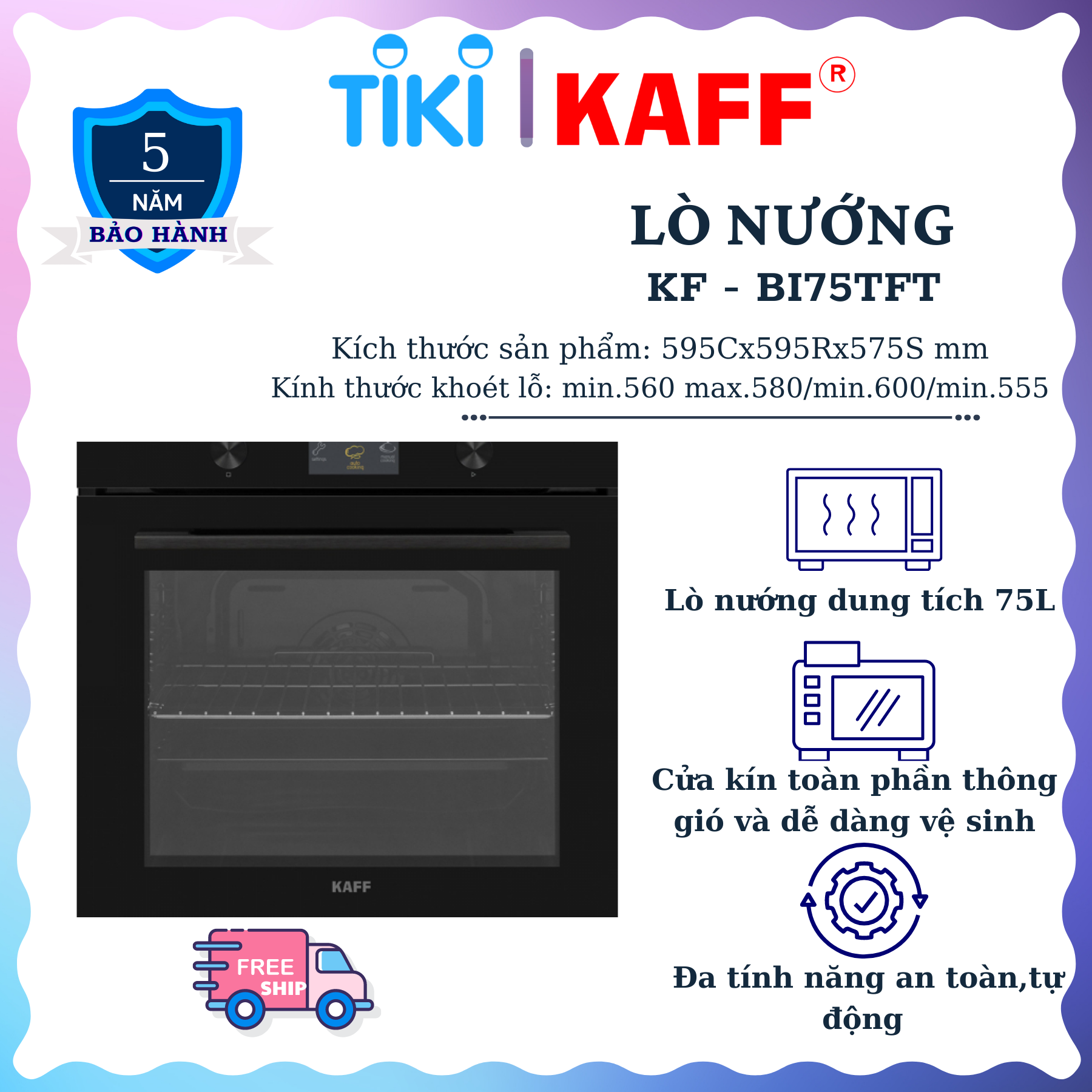 Lò nướng đối lưu lắp âm tủ KAFF KF-BI75TFT Thế Hệ Mới 2022 được nhập khẩu nguyên chiếc từ Thổ Nhỉ Kỳ được thiết kế âm tủ, chỉ để hở ra mặt trước,